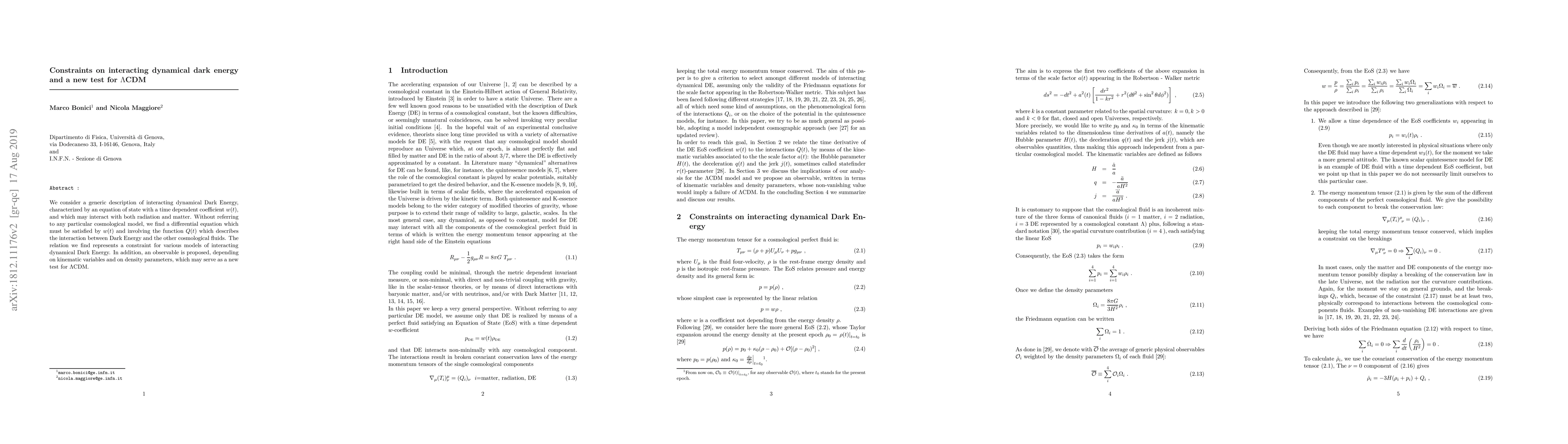 This paper derives a differential equation constraining interacting dynamical dark energy models characterized by a time-dependent equation of state. It also proposes an observable test based on kinematic variables and density parameters to evaluate the standard $\Lambda$CDM model.