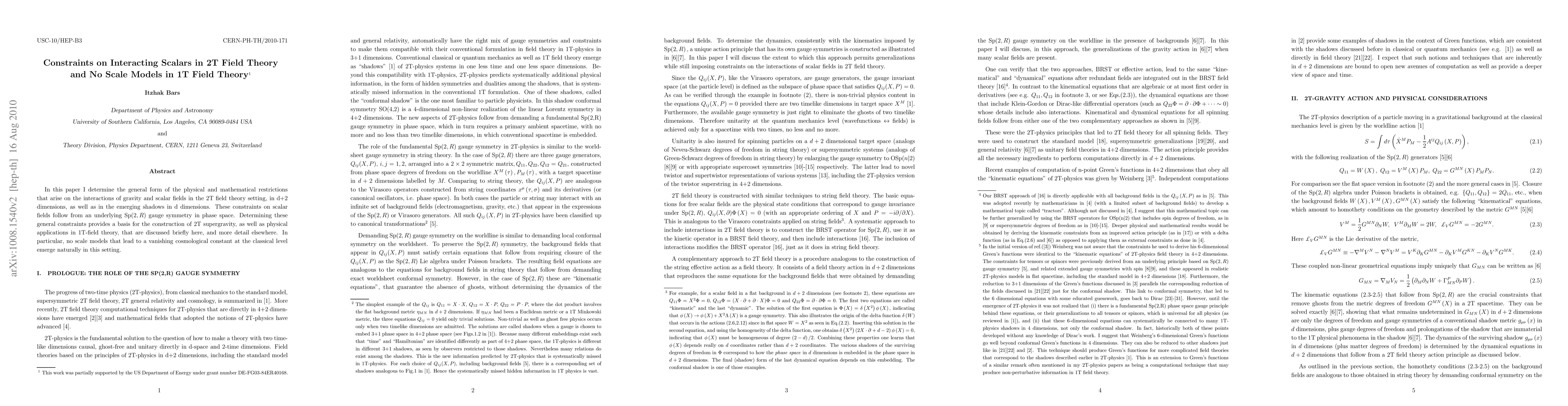 In this paper I determine the general form of the physical and mathematical restrictions that arise on the interactions of gravity and scalar fields in the 2T field theory setting, in d+2 dimensions, as well as in the emerging shadows in d dimensions. These constraints on scalar fields follow from an underlying Sp(2,R) gauge symmetry in phase space. Determining these general constraints provides a basis for the construction of 2T supergravity, as well as physical applications in 1T-field theory, that are discussed briefly here, and more detail elsewhere. In particular, no scale models that lead to a vanishing cosmological constant at the classical level emerge naturally in this setting.