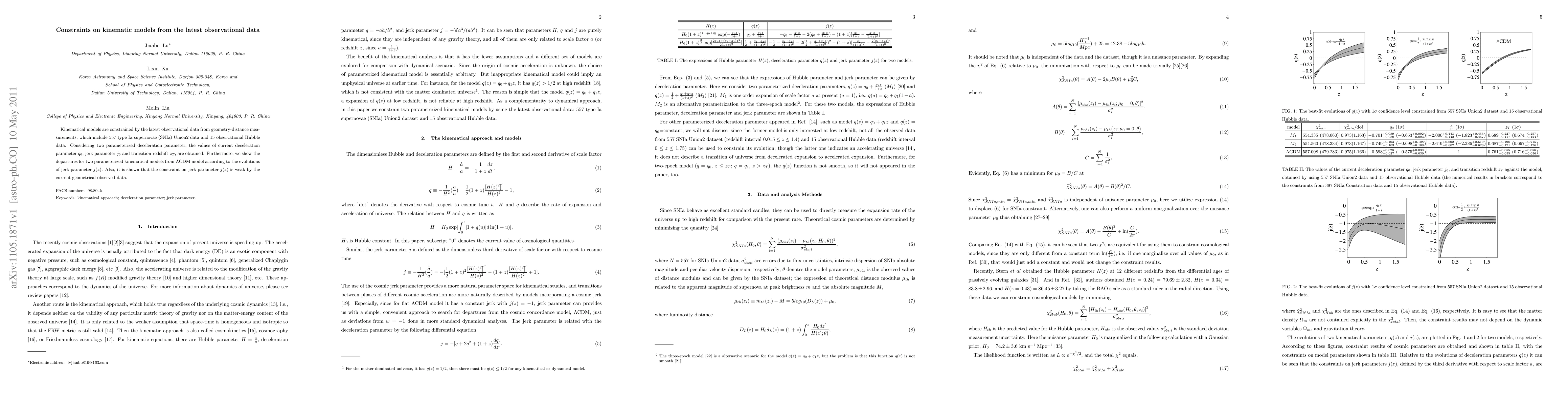 Kinematical models are constrained by the latest observational data from geometry-distance measurements, which include 557 type Ia supernovae (SNIa) Union2 data and 15 observational Hubble data. Considering two parameterized deceleration parameter, the values of current deceleration parameter $q_{0}$, jerk parameter $j_{0}$ and transition redshift $z_{T}$, are obtained. Furthermore, we show the departures for two parameterized kinematical models from $\Lambda$CDM model according to the evolutions of jerk parameter $j(z)$. Also, it is shown that the constraint on jerk parameter $j(z)$ is weak by the current geometrical observed data.