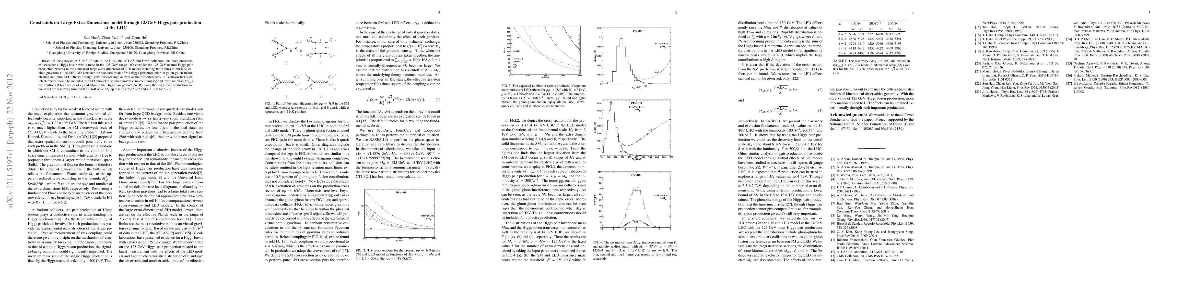 Based on the analysis of 5 fb^-1 of data at the LHC, the ATLAS and CMS collaborations have presented evidence for a Higgs boson with a mass in the 125 GeV range. We consider the 125 GeV neutral Higgs pair production process in the context of large-extra-dimensions (LED) model including the Kaluza-Klein (KK)excited gravitons at the LHC. We consider the standard model(SM) Higgs pair production in gluon-gluon fusion channel and pure LED effects through graviton exchange as well as their interferences. It is shown that such interferences should be included; the LED model raises the transverse momentum (Pt)and invariant mass (M_HH) distributions at high scales of Pt and M_HH of the Higgs pair production. By using the Higgs pair production we could set the discovery limit on the cutoff scale M_S up to 6 TeV for delta = 2 and 4.5 TeV for delta = 6.