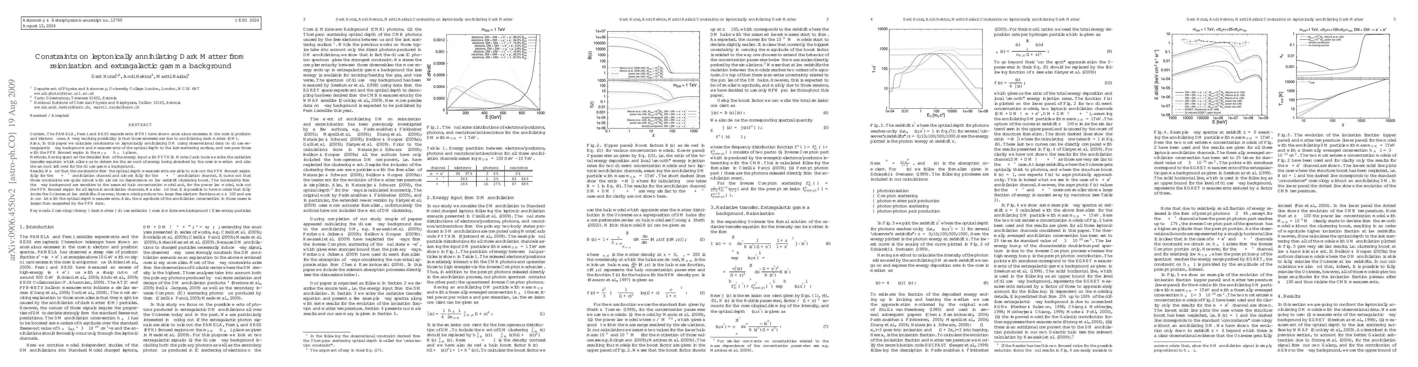 The PAMELA, Fermi and HESS experiments (PFH) have shown anomalous excesses in the cosmic positron and electron fluxes. A very exciting possibility is that those excesses are due to annihilating dark matter (DM). In this paper we calculate constraints on leptonically annihilating DM using observational data on diffuse extragalactic gamma-ray background and measurements of the optical depth to the last-scattering surface, and compare those with the PFH favored region in the m_{DM} - <\sigma_A v> plane. Having specified the detailed form of the energy input with PYTHIA Monte Carlo tools we solve the radiative transfer equation which allows us to determine the amount of energy being absorbed by the cosmic medium and also the amount left over for the diffuse gamma background. We find that the constraints from the optical depth measurements are able to rule out the PFH favored region fully for the \tau^{-}+\tau^{+} annihilation channel and almost fully for the \mu^{-}+\mu^{+} annihilation channel. It turns out that those constraints are quite robust with almost no dependence on low redshift clustering boost. The constraints from the gamma-ray background are sensitive to the assumed halo concentration model and, for the power law model, rule out the PFH favored region for all leptonic annihilation channels. We also find that it is possible to have models that fully ionize the Universe at low redshifts. However, those models produce too large free electron fractions at z > ~100 and are in conflict with the optical depth measurements. Also, the magnitude of the annihilation cross-section in those cases is larger than suggested by the PFH data.