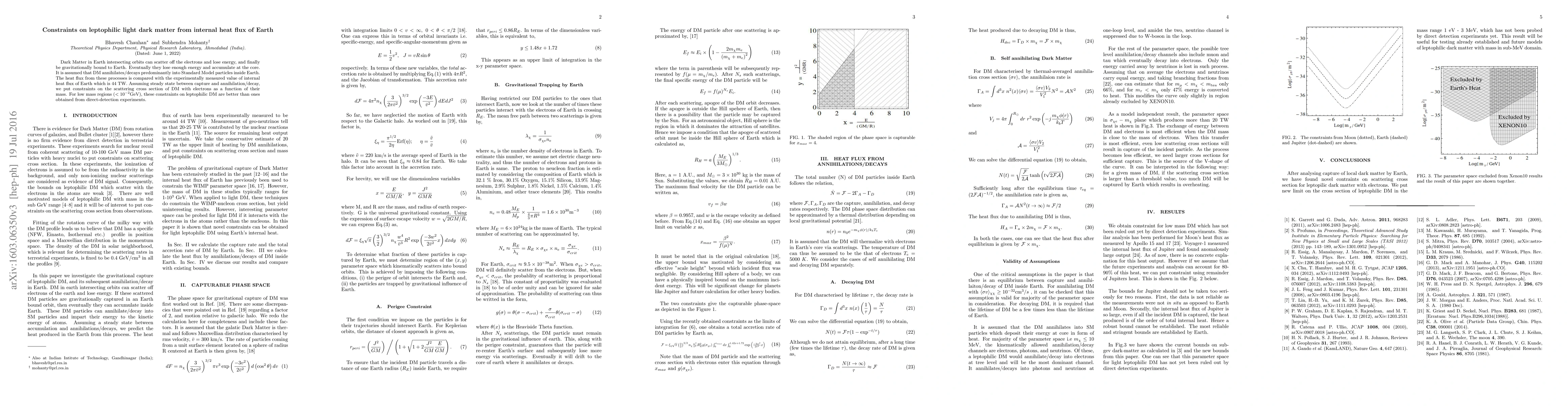 This paper investigates leptophilic light dark matter (DM) by analyzing its potential to scatter off electrons and accumulate in Earth's core, where it annihilates/decays into Standard Model particles. Constraints on the DM-electron scattering cross section are derived by comparing the resulting heat flux with Earth's measured internal heat flux of 44 TW, finding better constraints for low-mass DM than direct-detection experiments.