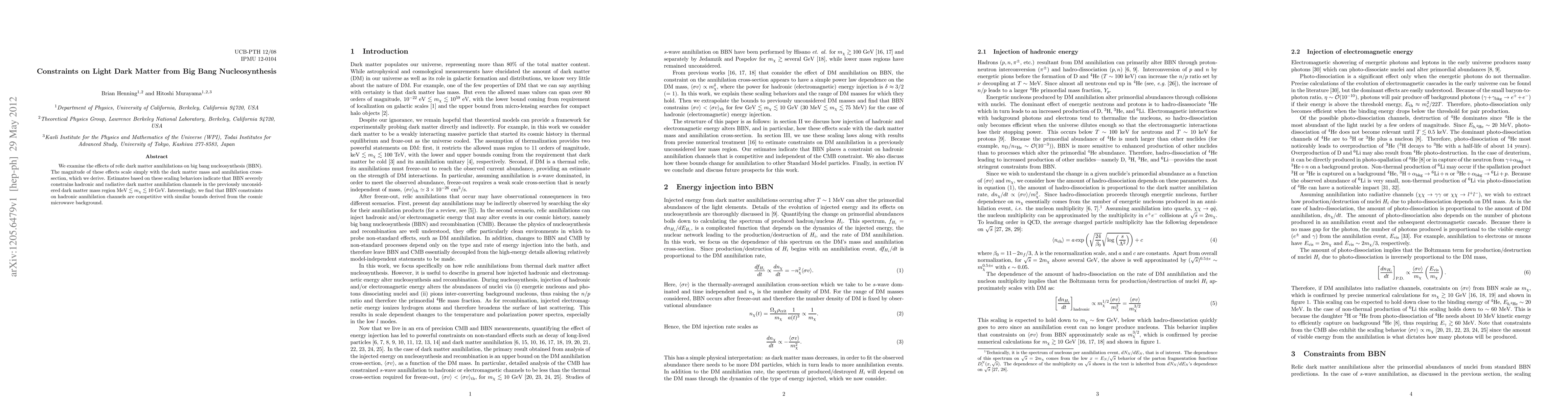 This paper investigates the impact of relic dark matter annihilations on big bang nucleosynthesis (BBN) and finds that BBN imposes stringent constraints on hadronic and radiative dark matter annihilation channels in the MeV to 10 GeV mass range, rivaling constraints from the cosmic microwave background.