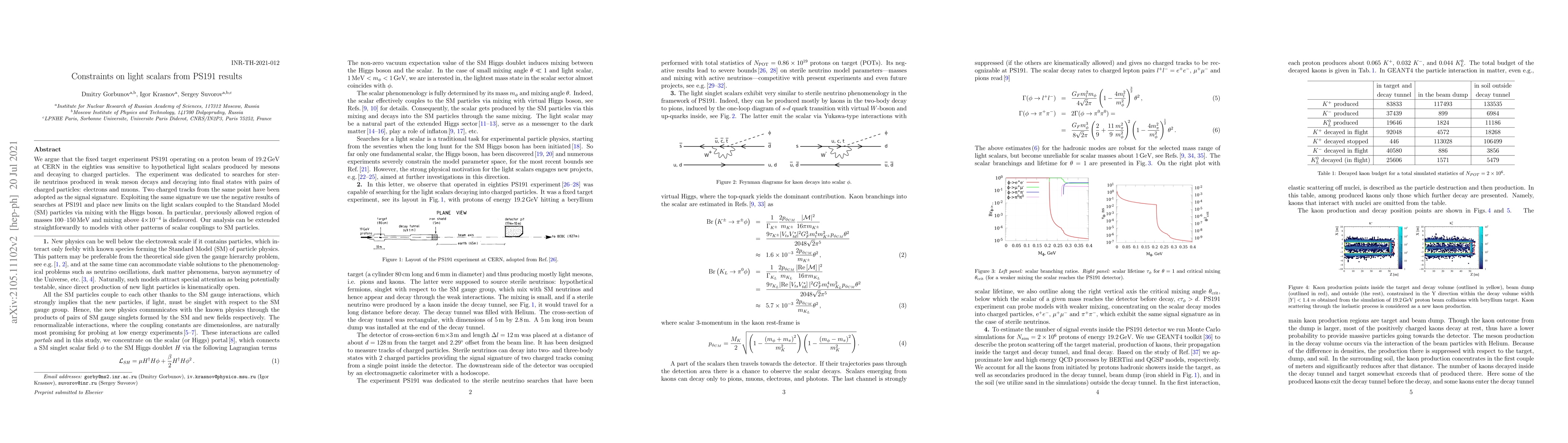 We argue that the fixed target experiment PS191 operating on a proton beam of 19.2 GeV at CERN in the eighties was sensitive to hypothetical light scalars produced by mesons and decaying to charged particles. The experiment was dedicated to searches for sterile neutrinos produced in weak meson decays and decaying into final states with pairs of charged particles: electrons and muons. Two charged tracks from the same point have been adopted as the signal signature. Exploiting the same signature we use the negative results of searches at PS191 and place new limits on the light scalars coupled to the Standard Model (SM) particles via mixing with the Higgs boson. In particular, previously allowed region of masses 100--150 MeV and mixing above 4$\times 10^{-4}$ is disfavored. Our analysis can be extended straightforwardly to models with other patterns of scalar couplings to SM particles.