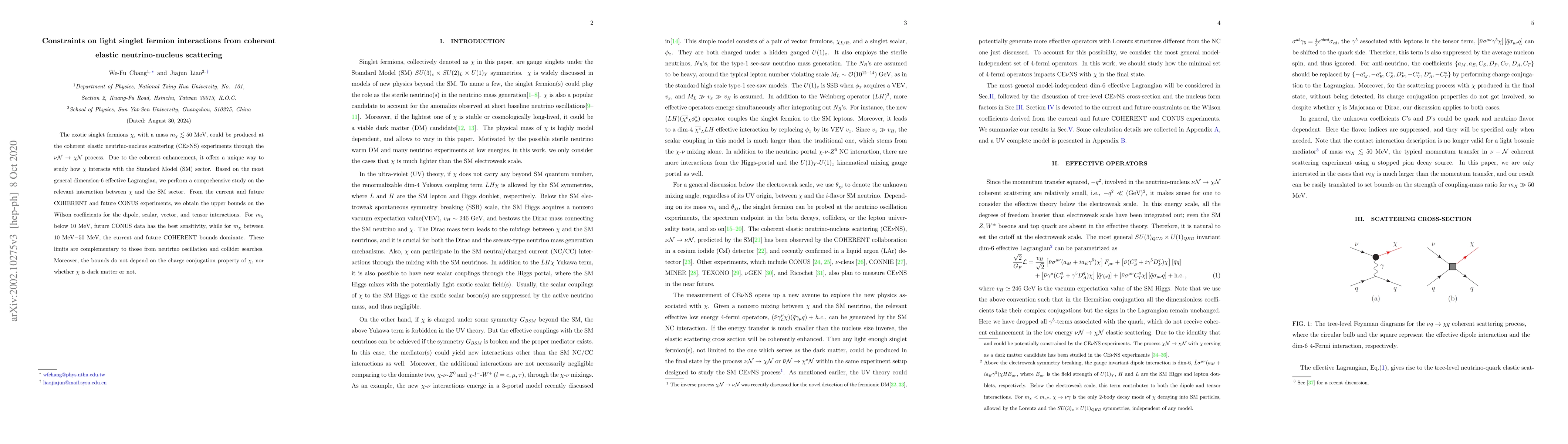 This paper investigates the interactions of light singlet fermions $\chi$ with the Standard Model via coherent elastic neutrino-nucleus scattering, setting new constraints on the Wilson coefficients for various interaction types. The study finds that future CONUS data will be most sensitive for $\chi$ masses below 10 MeV, while current and future COHERENT experiments provide the best limits for masses between 10 MeV and 50 MeV.