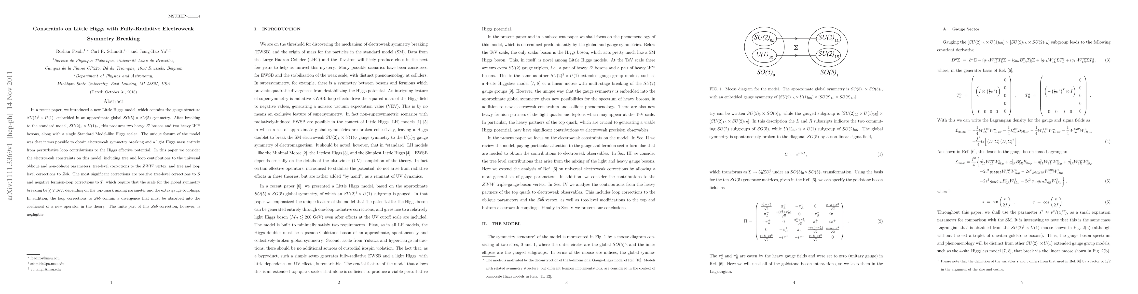 This paper examines the electroweak constraints on a new Little Higgs model with fully radiative symmetry breaking, revealing significant corrections to $\hat{S}$ and $\hat{T}$ parameters that necessitate a global symmetry breaking scale of at least 2 TeV. Additionally, loop corrections to $Zb\bar{b}$ introduce a divergence requiring a new operator in the theory, though the finite part of this correction is negligible.