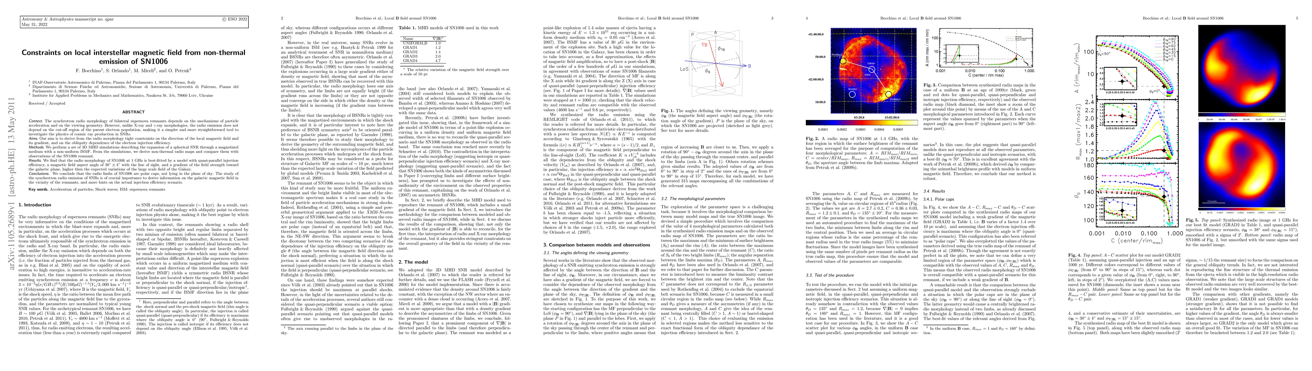 The synchrotron radio morphology of bilateral supernova remnants depends on the mechanisms of particle acceleration and on the viewing geometry. However, unlike X-ray and $\gamma$-ray morphologies, the radio emission does not depend on the cut-off region of the parent electron population, making it a simpler and more straightforward tool to investigate the physics of cosmic ray production in SNRs. Our aim is to derive from the radio morphology tight constraints on the direction of the local magnetic field and its gradient, and on the obliquity dependence of the electron injection efficiency. We perform a set of 3D MHD simulations describing the expansion of a spherical SNR through a magnetized medium with a non-uniform ISMF. From the simulations, we derive non-thermal radio maps and compare them with observations of the SN1006 remnant. We find that the radio morphology of SN1006 at 1 GHz is best-fitted by a model with quasi-parallel injection efficiency, a magnetic field aspect angle of $38^\circ\pm 4^\circ$ with the line of sight, and a gradient of the field strength toward the galactic plane, higher then the expected variations of the large scale field of the Galaxy. We conclude that the radio limbs of SN1006 are polar caps, not lying in the plane of sky}. The study of the synchrotron radio emission of SNRs is of crucial importance to derive information on the galactic magnetic field in the vicinity of the remnants, and more hints on the actual injection efficiency scenario.