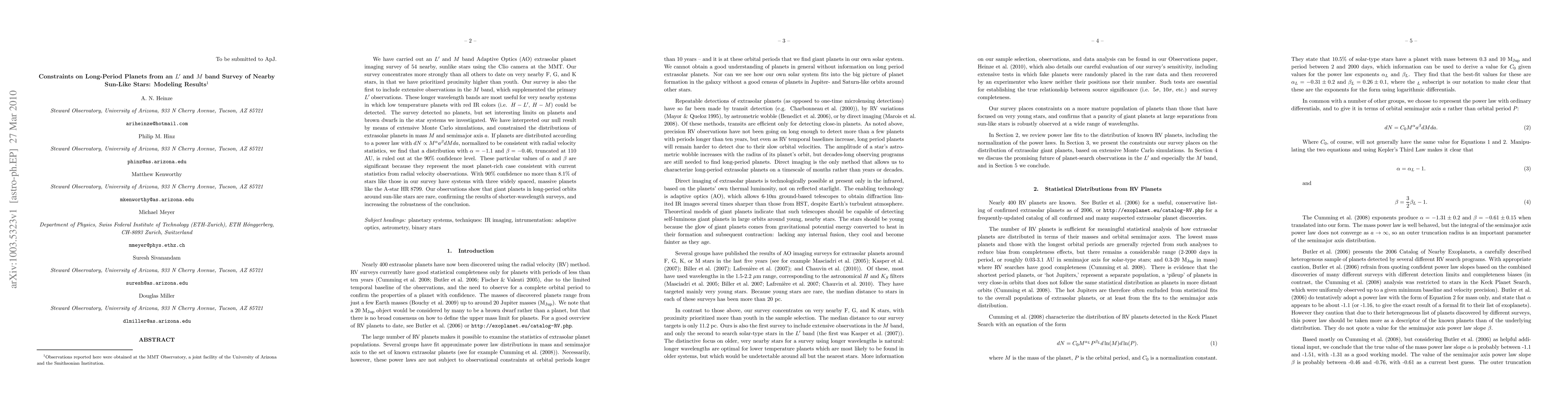 We have carried out an L' and M band Adaptive Optics (AO) extrasolar planet imaging survey of 54 nearby, sunlike stars using the Clio camera at the MMT. Our survey concentrates more strongly than all others to date on very nearby F, G, and K stars, in that we have prioritized proximity higher than youth. Our survey is also the first to include extensive observations in the M band, which supplemented the primary L' observations. These longer wavelength bands are most useful for very nearby systems in which low temperature planets with red IR colors (i.e. H - L', H - M) could be detected. The survey detected no planets, but set interesting limits on planets and brown dwarfs in the star systems we investigated. We have interpreted our null result by means of extensive Monte Carlo simulations, and constrained the distributions of extrasolar planets in mass $M$ and semimajor axis $a$. If planets are distributed according to a power law with $dN \propto M^{\alpha} a^{\beta} dM da$, normalized to be consistent with radial velocity statistics, we find that a distribution with $\alpha = -1.1$ and $\beta = -0.46$, truncated at 110 AU, is ruled out at the 90% confidence level. These particular values of $\alpha$ and $\beta$ are significant because they represent the most planet-rich case consistent with current statistics from radial velocity observations. With 90% confidence no more than 8.1% of stars like those in our survey have systems with three widely spaced, massive planets like the A-star HR 8799. Our observations show that giant planets in long-period orbits around sun-like stars are rare, confirming the results of shorter-wavelength surveys, and increasing the robustness of the conclusion.