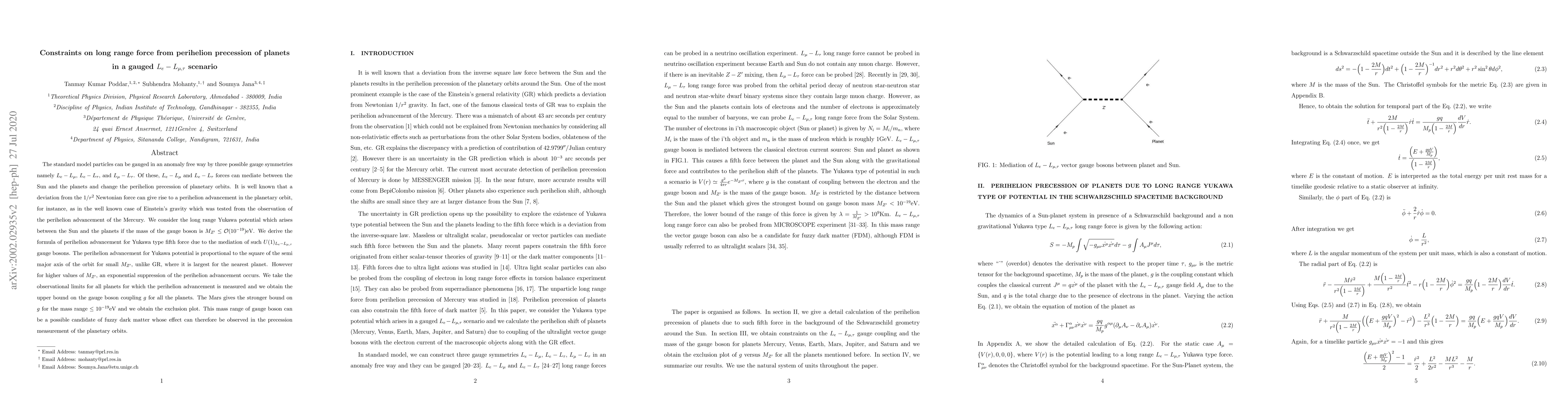 The standard model particles can be gauged in an anomaly free way by three possible gauge symmetries namely ${L_e-L_\mu}$, ${L_e-L_\tau}$, and ${L_\mu-L_\tau}$. Of these, ${L_e-L_\mu}$ and ${L_e-L_\tau}$ forces can mediate between the Sun and the planets and change the perihelion precession of planetary orbits. It is well known that a deviation from the $1/r^2$ Newtonian force can give rise to a perihelion advancement in the planetary orbit, for instance, as in the well known case of Einstein's gravity which was tested from the observation of the perihelion advancement of the Mercury. We consider the long range Yukawa potential which arises between the Sun and the planets if the mass of the gauge boson is $M_{Z^{\prime}}\leq \mathcal{O}(10^{-19})\rm {eV}$. We derive the formula of perihelion advancement for Yukawa type fifth force due to the mediation of such $U(1)_{L_e-L_{\mu,\tau}}$ gauge bosons. The perihelion advancement for Yukawa potential is proportional to the square of the semi major axis of the orbit for small $M_{Z^{\prime}}$, unlike GR, where it is largest for the nearest planet. However for higher values of $M_{Z^{\prime}}$, an exponential suppression of the perihelion advancement occurs. We take the observational limits for all planets for which the perihelion advancement is measured and we obtain the upper bound on the gauge boson coupling $g$ for all the planets. The Mars gives the stronger bound on $g$ for the mass range $\leq 10^{-19}\rm{eV}$ and we obtain the exclusion plot. This mass range of gauge boson can be a possible candidate of fuzzy dark matter whose effect can therefore be observed in the precession measurement of the planetary orbits.