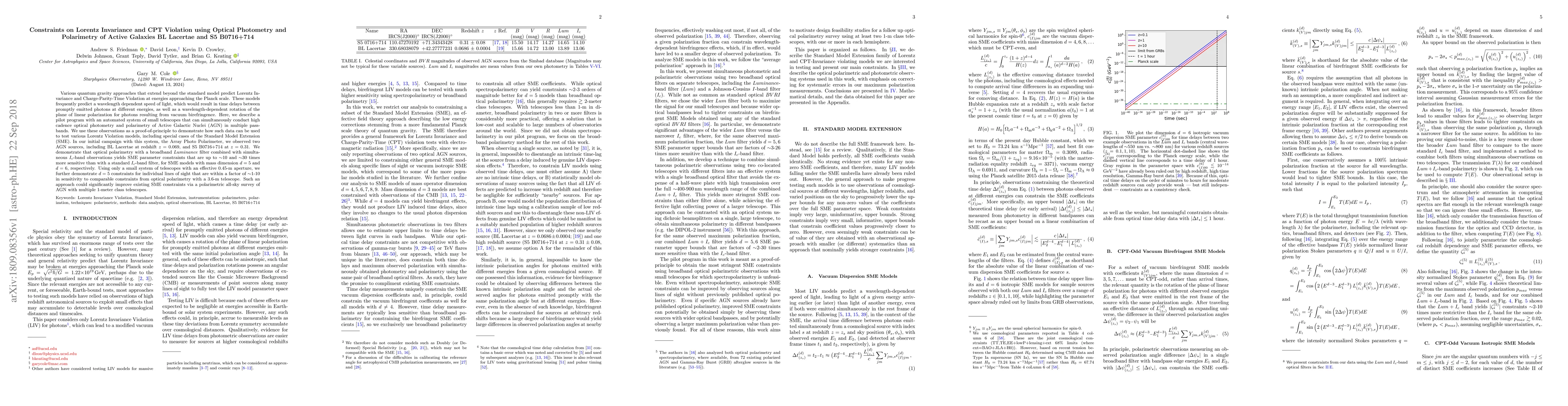 Various quantum gravity approaches that extend beyond the standard model predict Lorentz Invariance and Charge-Parity-Time Violation at energies approaching the Planck scale. These models frequently predict a wavelength dependent speed of light, which would result in time delays between promptly emitted photons at different energies, as well as a wavelength-dependent rotation of the plane of linear polarization for photons resulting from vacuum birefringence. Here, we describe a pilot program with an automated system of small telescopes that can simultaneously conduct high cadence optical photometry and polarimetry of Active Galactic Nuclei (AGN) in multiple passbands. We use these observations as a proof-of-principle to demonstrate how such data can be used to test various Lorentz Violation models, including special cases of the Standard Model Extension (SME). In our initial campaign with this system, the Array Photo Polarimeter, we observed two AGN sources, including BL Lacertae at redshift z = 0.069, and S5 B0716+714 at z = 0.31. We demonstrate that optical polarimetry with a broadband Luminance filter combined with simultaneous $I_c$-band observations yields SME parameter constraints that are up to ~10 and ~30 times more sensitive than with a standard $I_c$-band filter, for SME models with mass dimension d = 5 and d = 6, respectively. Using only a small system of telescopes with an effective 0.45-m aperture, we further demonstrate d = 5 constraints for individual lines of sight that are within a factor of ~1-10 in sensitivity to comparable constraints from optical polarimetry with a 3.6-m telescope. Such an approach could significantly improve existing SME constraints via a polarimetric all-sky survey of AGN with multiple 1-meter class telescopes.