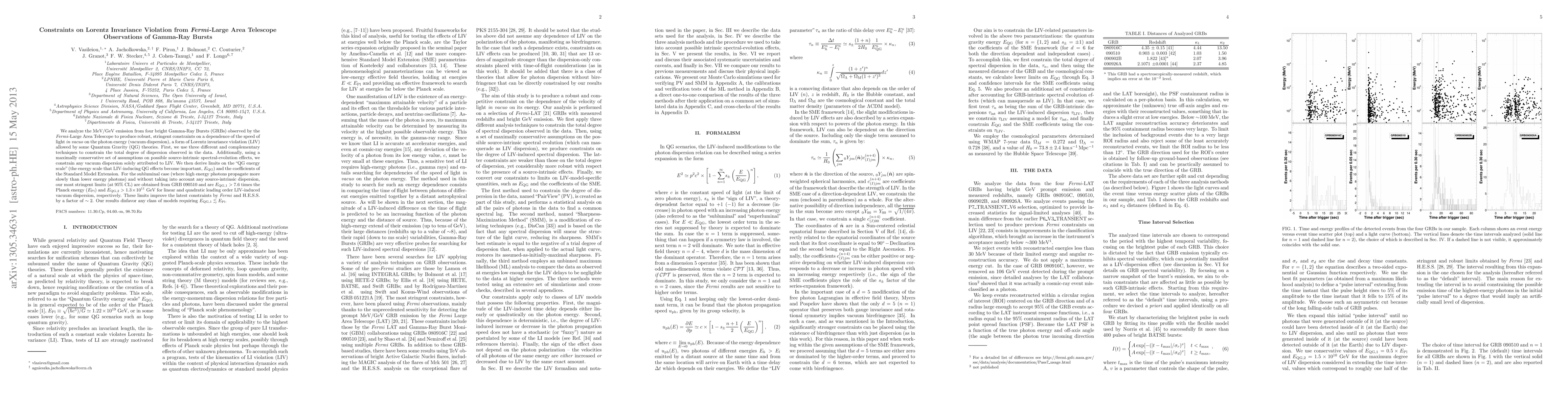 This paper uses Fermi-Large Area Telescope observations of four bright Gamma-Ray Bursts to derive stringent constraints on Lorentz invariance violation (LIV) through vacuum dispersion. The study improves previous limits by a factor of ~2, finding that the energy scale for LIV-inducing quantum gravity effects (E_QG) must exceed 7.6 times the Planck energy, disfavoring models with E_QG near the Planck scale.