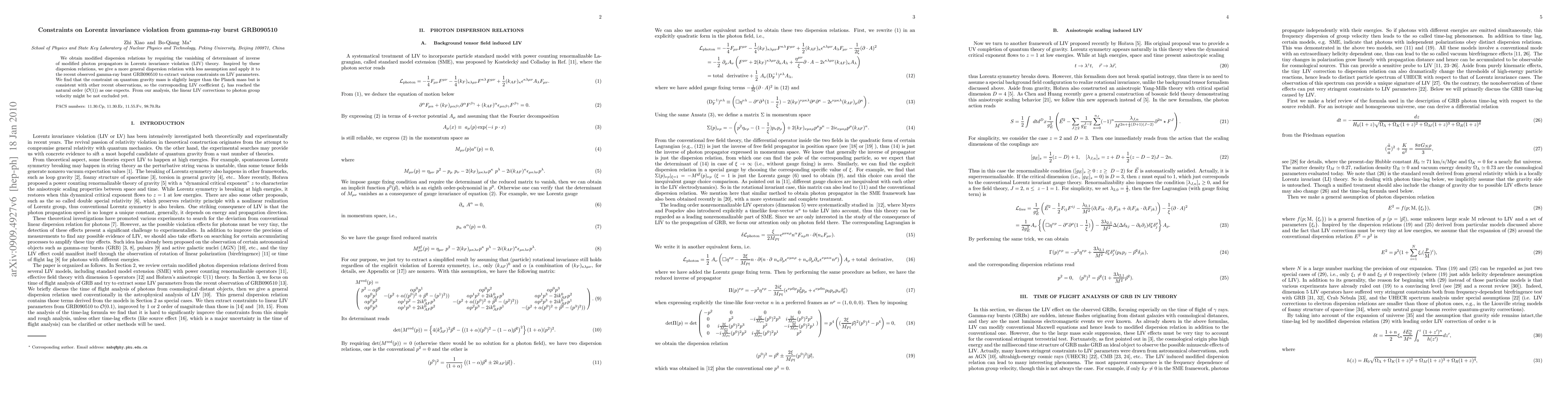 We obtain modified dispersion relations by requiring the vanishing of determinant of inverse of modified photon propagators in Lorentz invariance violation (LIV) theory. Inspired by these dispersion relations, we give a more general dispersion relation with less assumption and apply it to the recent observed gamma-ray burst GRB090510 to extract various constraints on LIV parameters. We find that the constraint on quantum gravity mass is slightly larger than the Planck mass but is consistent with the other recent observations, so the corresponding LIV coefficient $\xi_1$ has reached the natural order ($o(1)$) as one expects. From our analysis, the linear LIV corrections to photon group velocity might be not excluded yet.