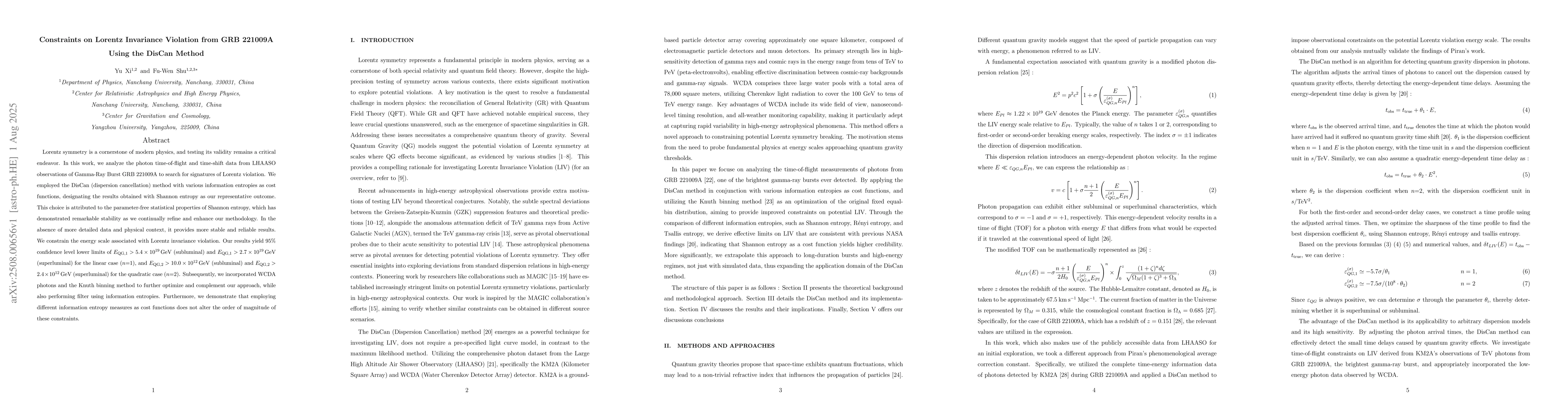 Lorentz symmetry is a cornerstone of modern physics, and testing its validity remains a critical endeavor. In this work, we analyze the photon time-of-flight and time-shift data from LHAASO observations of Gamma-Ray Burst GRB 221009A to search for signatures of Lorentz violation. We employed the DisCan (dispersion cancellation) method with various information entropies as cost functions, designating the results obtained with Shannon entropy as our representative outcome. This choice is attributed to the parameter-free statistical properties of Shannon entropy, which has demonstrated remarkable stability as we continually refine and enhance our methodology. In the absence of more detailed data and physical context, it provides more stable and reliable results. We constrain the energy scale associated with Lorentz invariance violation. Our results yield 95\% confidence level lower limits of $E_{\text{QG},1} > 5.4 \times 10^{19} \, \text{GeV}$ (subluminal) and $E_{\text{QG},1} > 2.7 \times 10^{19} \, \text{GeV}$ (superluminal) for the linear case ($n$=1), and $E_{\text{QG},2} > 10.0 \times 10^{12} \, \text{GeV}$ (subluminal) and $E_{\text{QG},2} > 2.4 \times 10^{12} \, \text{GeV}$ (superluminal) for the quadratic case ($n$=2). Subsequently, we incorporated WCDA photons and the Knuth binning method to further optimize and complement our approach, while also performing filter using information entropies. Furthermore, we demonstrate that employing different information entropy measures as cost functions does not alter the order of magnitude of these constraints.