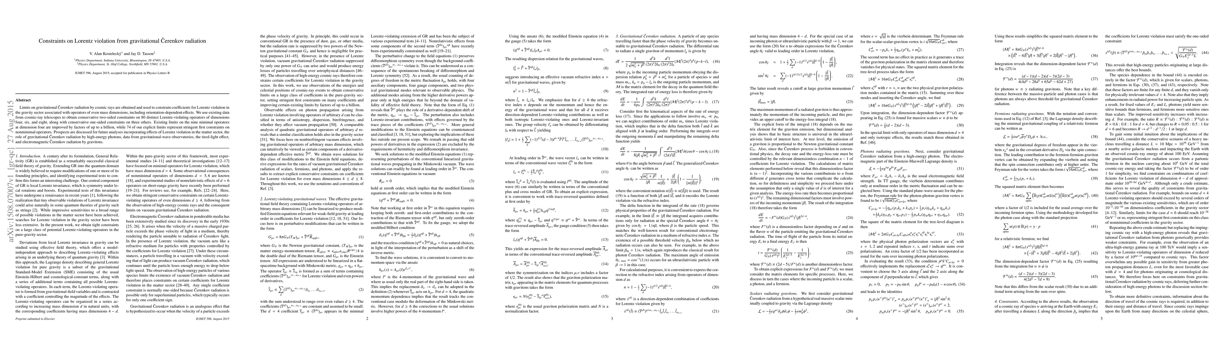 This paper derives stringent limits on Lorentz violation in gravity through gravitational Cherenkov radiation by cosmic rays, improving existing constraints on 80 distinct operators and providing first constraints on 74 nonminimal operators. Future prospects include analyses incorporating matter sector effects and data from gravitational-wave observatories.