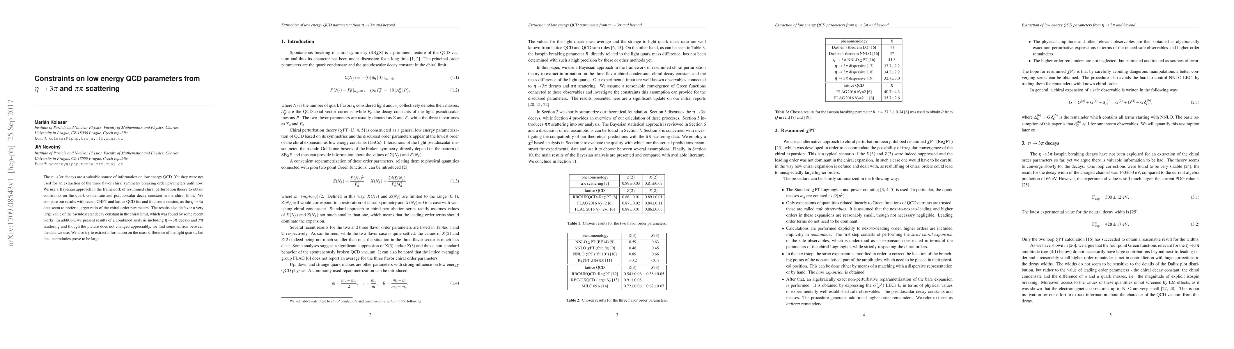 This study uses Bayesian approach in chiral perturbation theory to derive constraints on quark condensate and pseudoscalar decay constant from $eta o 3pi$ decays. Results show tension with recent CHPT and lattice QCD fits, suggesting larger chiral order parameters and disfavoring very large decay constants. A combined analysis of $eta o 3pi$ decays and $pipi$ scattering also reveals tension, while mass difference of light quarks extraction has large uncertainties.