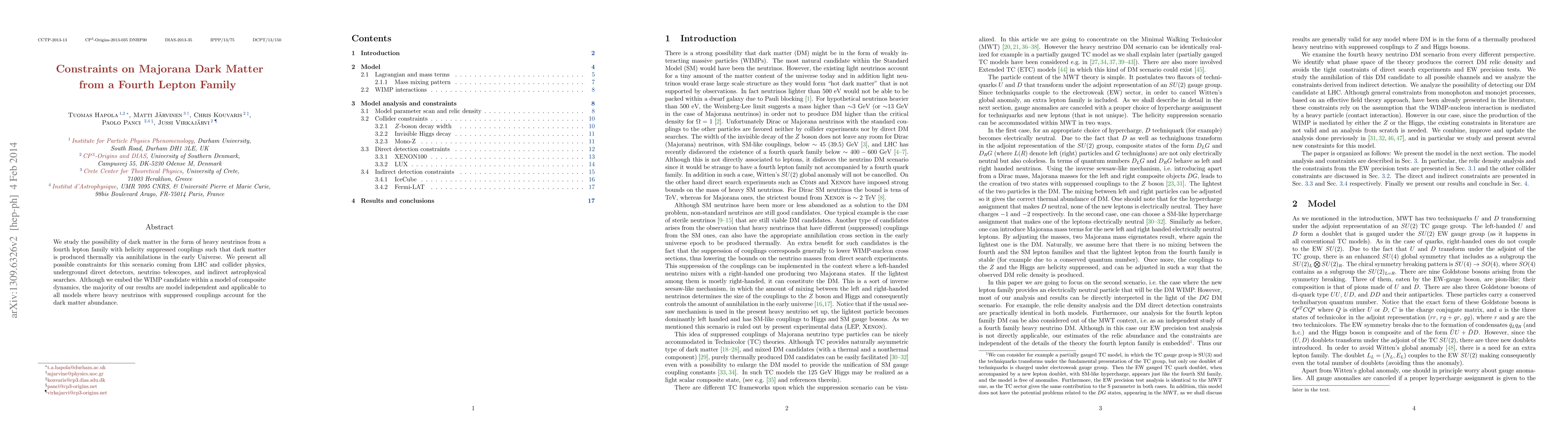 We study the possibility of dark matter in the form of heavy neutrinos from a fourth lepton family with helicity suppressed couplings such that dark matter is produced thermally via annihilations in the early Universe. We present all possible constraints for this scenario coming from LHC and collider physics, underground direct detectors, neutrino telescopes, and indirect astrophysical searches. Although we embed the WIMP candidate within a model of composite dynamics, the majority of our results are model independent and applicable to all models where heavy neutrinos with suppressed couplings account for the dark matter abundance.