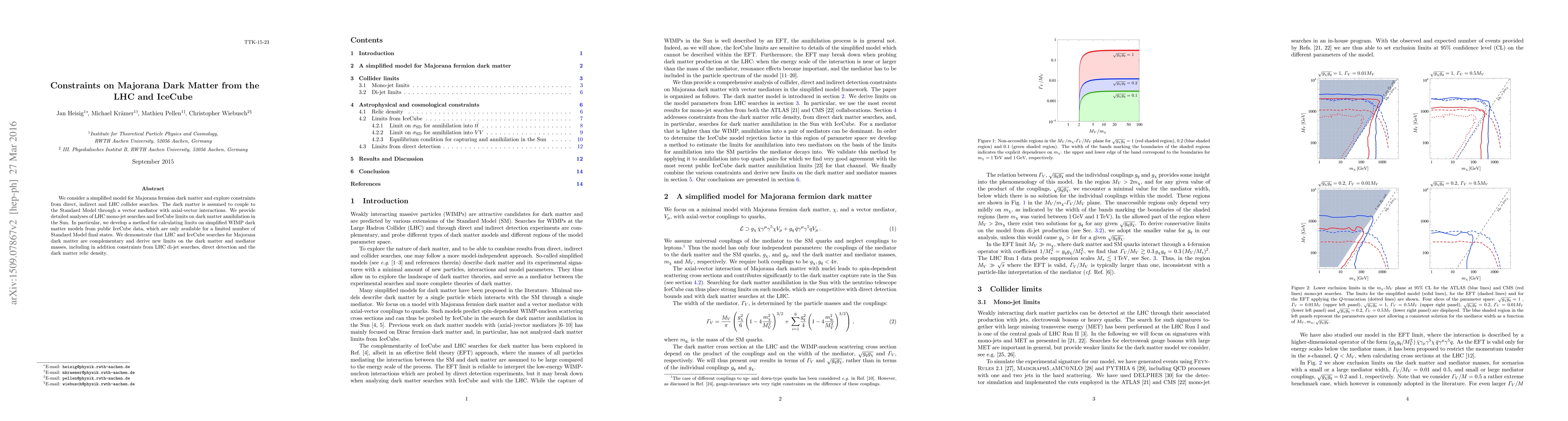 This paper investigates constraints on Majorana fermion dark matter using LHC and IceCube data. It combines results from LHC mono-jet and di-jet searches, direct detection, and IceCube's solar dark matter annihilation limits to derive new bounds on dark matter and mediator masses.