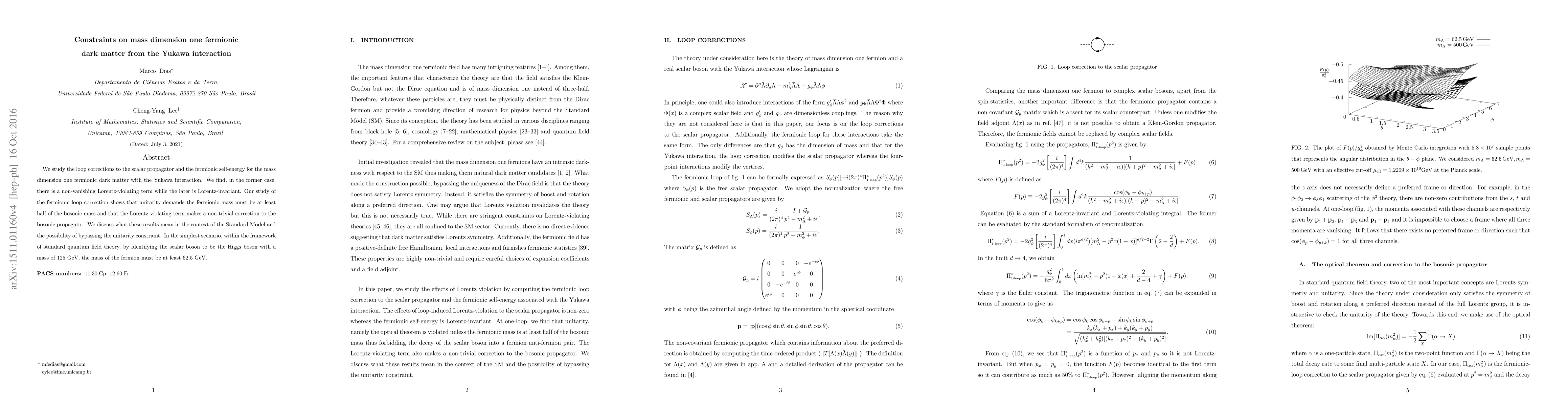 This paper investigates loop corrections for mass dimension one fermionic dark matter with Yukawa interaction, revealing a non-vanishing Lorentz-violating term in scalar propagator corrections. It concludes that unitarity requires the fermionic mass to be at least half the bosonic mass, with implications for the Standard Model and the Higgs boson mass of 125 GeV necessitating a fermionic mass of at least 62.5 GeV.