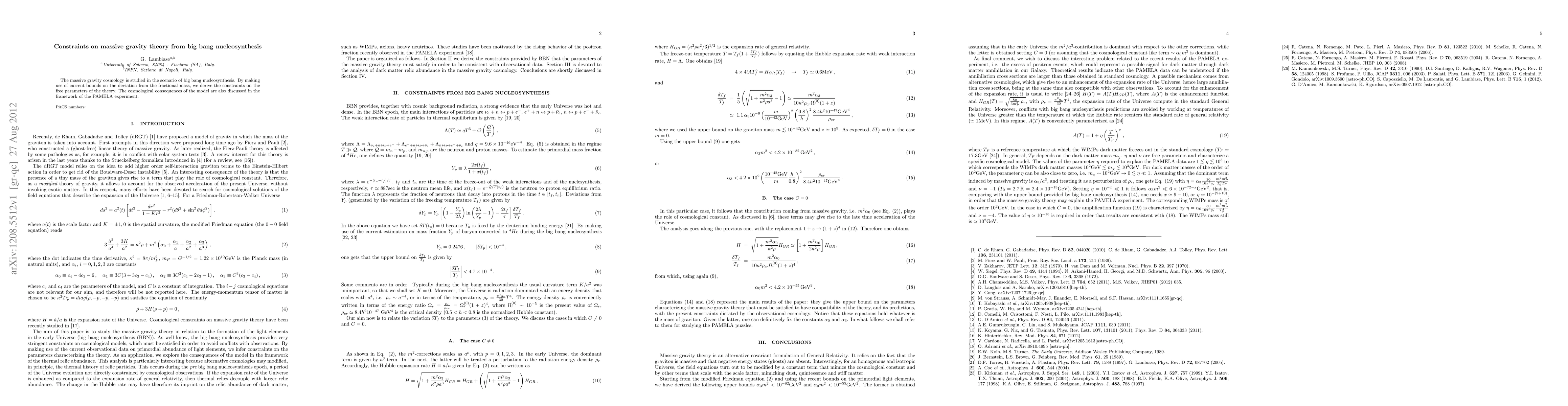This paper investigates the implications of massive gravity theory during big bang nucleosynthesis, deriving constraints on its parameters using current observational data. It also discusses the cosmological consequences and links them to results from the PAMELA experiment.