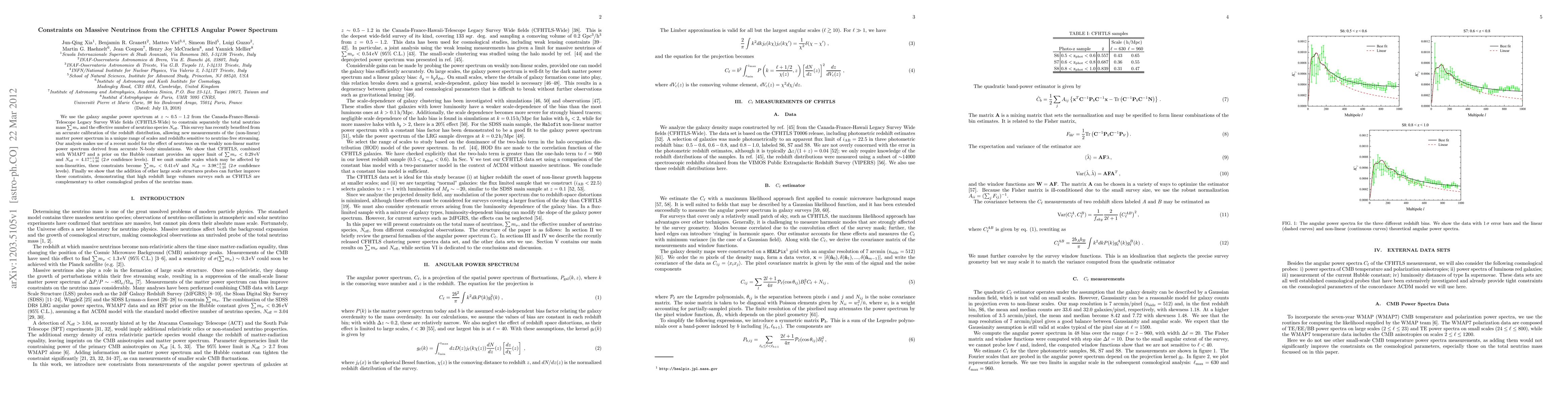 We use the galaxy angular power spectrum at $z\sim0.5-1.2$ from the Canada-France-Hawaii-Telescope Legacy Survey Wide fields (CFHTLS-Wide) to constrain separately the total neutrino mass $\sum{m_\nu}$ and the effective number of neutrino species $N_{\rm{eff}}$. This survey has recently benefited from an accurate calibration of the redshift distribution, allowing new measurements of the (non-linear) matter power spectrum in a unique range of scales and redshifts sensitive to neutrino free streaming. Our analysis makes use of a recent model for the effect of neutrinos on the weakly non-linear matter power spectrum derived from accurate N-body simulations. We show that CFHTLS, combined with WMAP7 and a prior on the Hubble constant provides an upper limit of $\sum{m_\nu}<0.29\,$eV and $N_{\rm{eff}} =4.17^{+1.62}_{-1.26}$ (2$\,\sigma$ confidence levels). If we omit smaller scales which may be affected by non-linearities, these constraints become $\sum{m_\nu}<0.41\,$eV and $N_{\rm{eff}} =3.98^{+2.02}_{-1.20}$ (2$\,\sigma$ confidence levels). Finally we show that the addition of other large scale structures probes can further improve these constraints, demonstrating that high redshift large volumes surveys such as CFHTLS are complementary to other cosmological probes of the neutrino mass.
