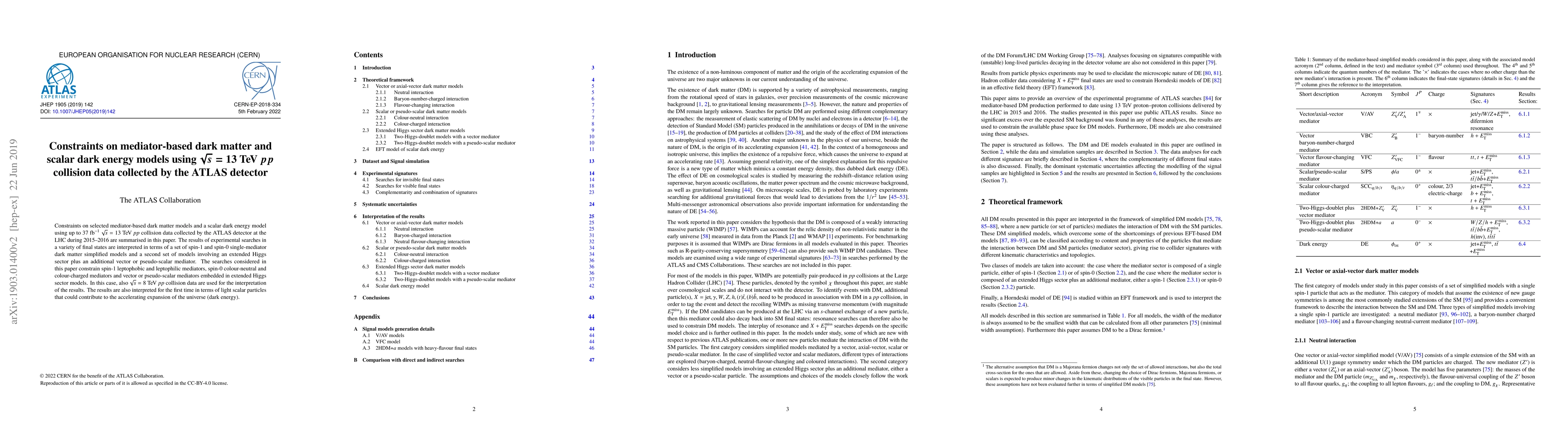 Constraints on selected mediator-based dark matter models and a scalar dark energy model using up to $37~\mathrm{fb}^{-1}$ $\sqrt s = 13$ TeV $pp$ collision data collected by the ATLAS detector at the LHC during 2015-2016 are summarised in this paper. The results of experimental searches in a variety of final states are interpreted in terms of a set of spin-1 and spin-0 single-mediator dark matter simplified models and a second set of models involving an extended Higgs sector plus an additional vector or pseudo-scalar mediator. The searches considered in this paper constrain spin-1 leptophobic and leptophilic mediators, spin-0 colour-neutral and colour-charged mediators and vector or pseudo-scalar mediators embedded in extended Higgs sector models. In this case, also $\sqrt s = 8$ TeV $pp$ collision data are used for the interpretation of the results. The results are also interpreted for the first time in terms of light scalar particles that could contribute to the accelerating expansion of the universe (dark energy).