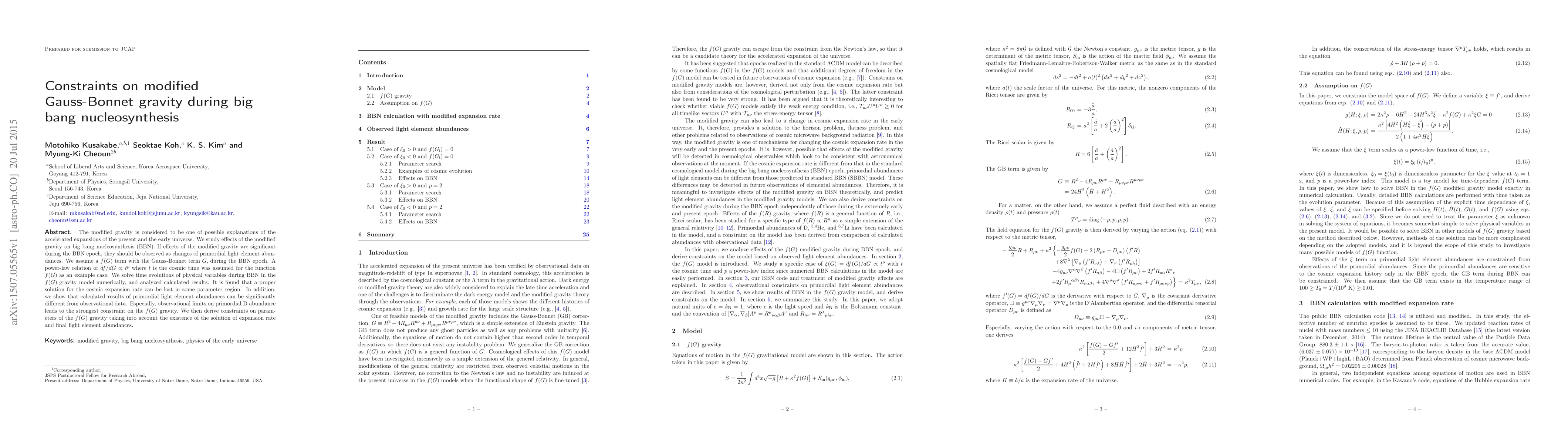 This paper investigates the effects of modified Gauss-Bonnet gravity ($f(G)$) on big bang nucleosynthesis (BBN) and finds that significant modifications could lead to discrepancies in primordial light element abundances. The study derives constraints on $f(G)$ parameters, particularly noting that observational limits on primordial deuterium abundance provide the strongest constraint.