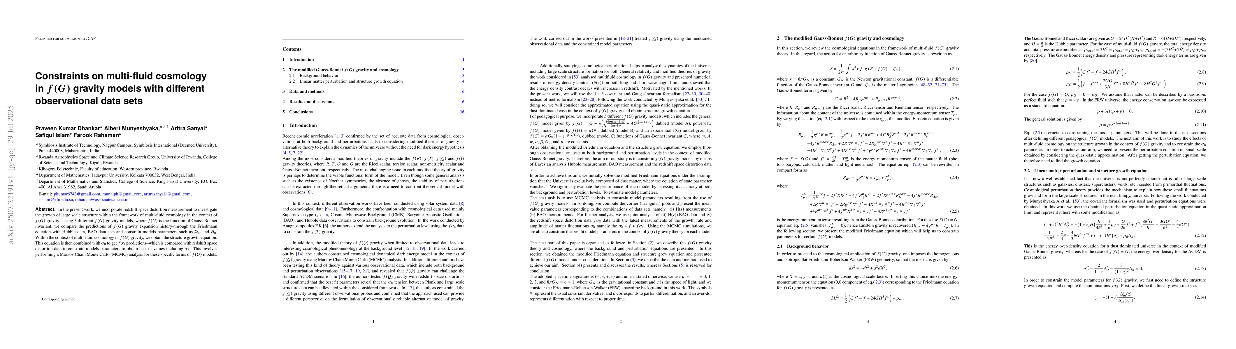 In the present work, we incorporate redshift-space distortion measurement to investigate the growth of large scale structure within the framework of multi-fluid cosmology in the context of modified Gauss-Bonnet gravity. Using three different modified Gauss-Bonnet gravity models, we compare the predictions of modified Gauss-Bonnet gravity expansion history-through the Friedmann equation with Hubble and BAO data sets and constrain models parameters. Within the context of multi-fluid cosmology in modified Gauss-Bonnet gravity, we obtain the structure growth equation. This equation is then combined with Sigma_8 to get f_Sigma_8 predictions-which is compared with redshift-space distortion data to constrain models parameters to obtain best-fit values including Sigma_8. This involves performing a Markov Chain Monte Carlo (MCMC) analysis for these specific forms of modified Gauss-Bonnet models.