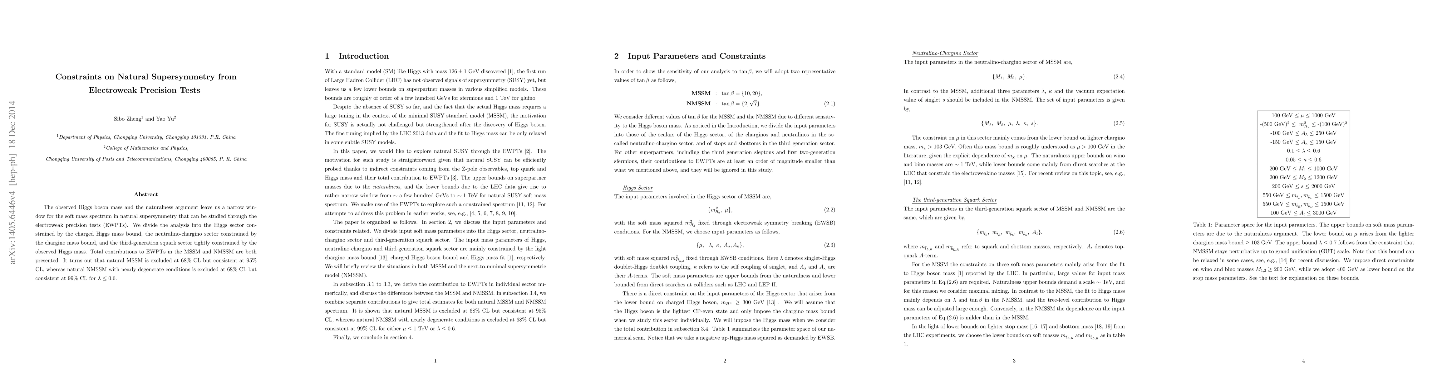 This paper examines constraints on natural supersymmetry (SUSY) using electroweak precision tests (EWPTs), focusing on the Higgs, neutralino-chargino, and third-generation squark sectors. It finds that natural MSSM is excluded at 68% confidence level but remains consistent at 95%, while natural NMSSM with nearly degenerate conditions is excluded at 68% but consistent at 99% for $\lambda\leq 0.6$.