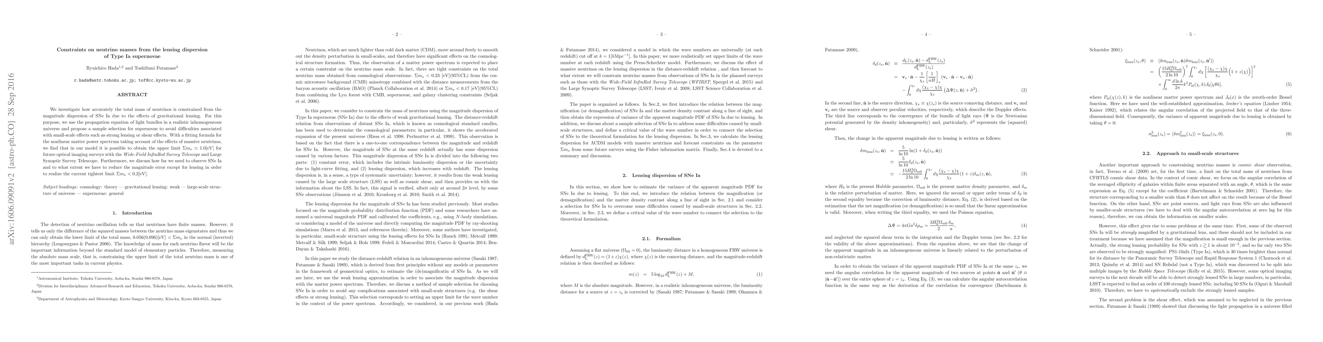 We investigate how accurately the total mass of neutrinos is constrained from the magnitude dispersion of SNe Ia due to the effects of gravitational lensing. For this purpose, we use the propagation equation of light bundles in a realistic inhomogeneous universe and propose a sample selection for supernovae to avoid difficulties associated with small-scale effects such as strong lensing or shear effects. With a fitting formula for the nonlinear matter power spectrum taking account of the effects of massive neutrinos, we find that in our model it is possible to obtain the upper limit $\Sigma m_{\nu} \simeq 1.0[{\rm eV}]$ for future optical imaging surveys with the Wide-Field InfraRed Survey Telescope and Large Synoptic Survey Telescope. Furthermore, we discuss how far we need to observe SNe Ia and to what extent we have to reduce the magnitude error except for lensing in order to realize the current tightest limit $\Sigma m_{\nu} < 0.2[{\rm eV}]$.