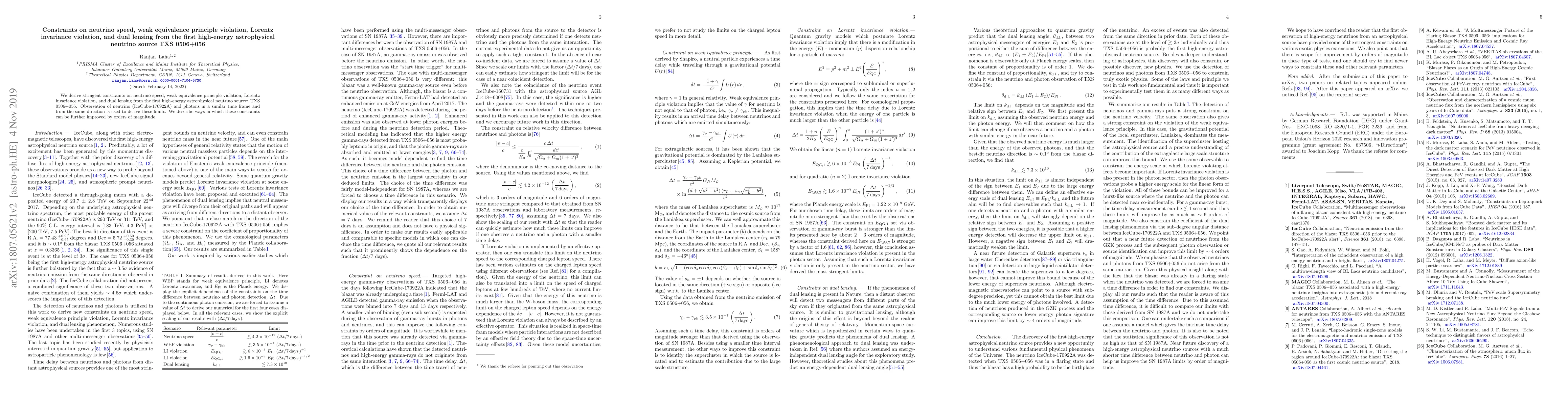 This paper derives stringent constraints on neutrino speed, weak equivalence principle violation, Lorentz invariance violation, and dual lensing using the high-energy astrophysical neutrino source TXS 0506+056. Observations of a neutrino and photons from the same source provide the basis for these limits, with potential for significant improvements in future studies.