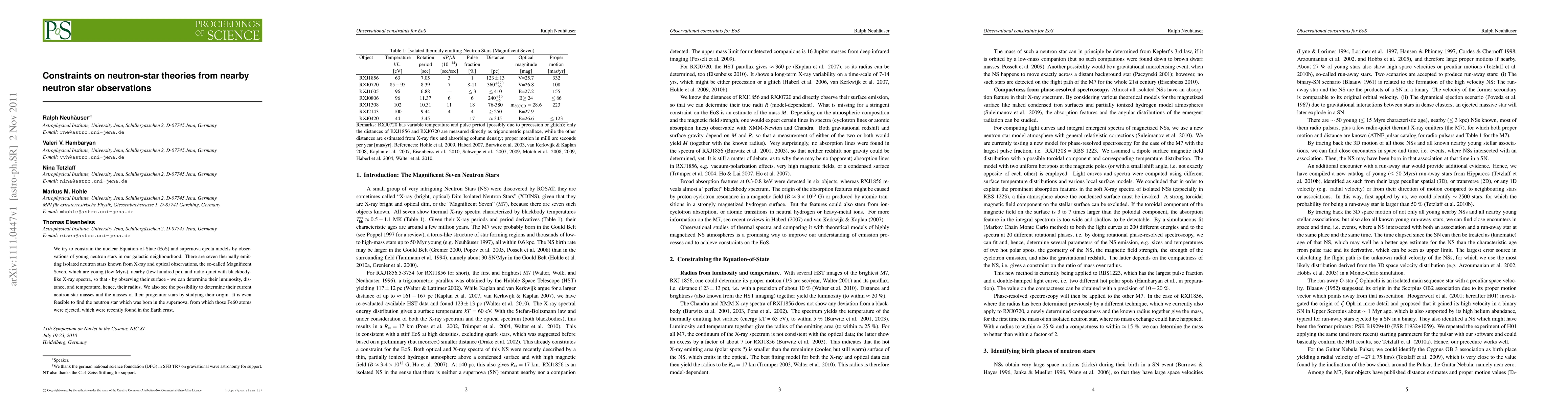 We try to constrain the nuclear Equation-of-State (EoS) and supernova ejecta models by observations of young neutron stars in our galactic neighbourhood. There are seven thermally emitting isolated neutron stars known from X-ray and optical observations, the so-called Magnificent Seven, which are young (few Myrs), nearby (few hundred pc), and radio-quiet with blackbody-like X-ray spectra, so that - by observing their surface - we can determine their luminosity, distance, and temperature, hence, their radius. We also see the possibility to determine their current neutron star masses and the masses of their progenitor stars by studying their origin. It is even feasible to find the neutron star which was born in the supernova, from which those Fe60 atoms were ejected, which were recently found in the Earth crust.