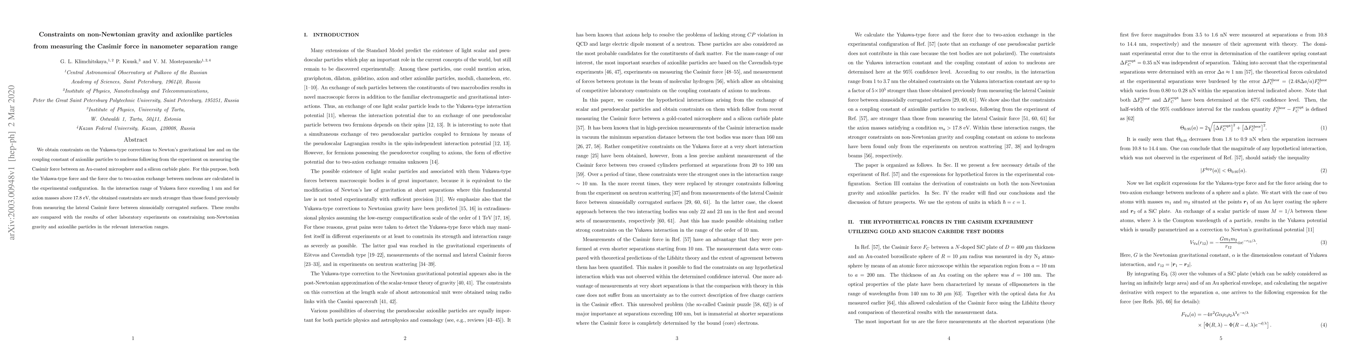 This paper derives stringent constraints on non-Newtonian gravitational modifications and axionlike particles by measuring the Casimir force between a Au-coated microsphere and a silicon carbide plate, outperforming previous constraints from similar experiments. The results are compared with other laboratory experiments for validation.