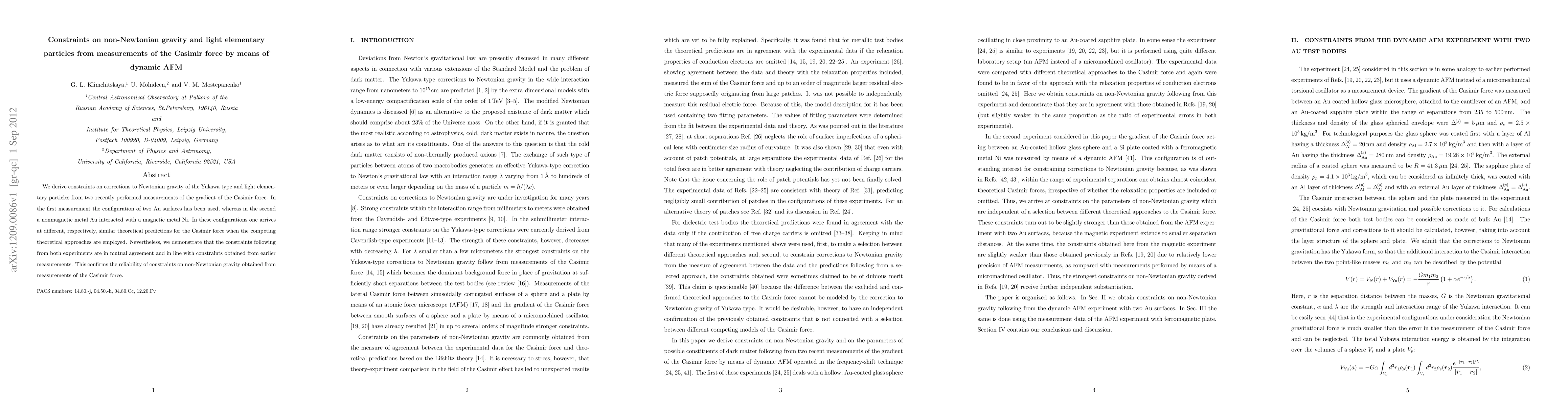 This paper derives constraints on Yukawa-type corrections to Newtonian gravity and light elementary particles using dynamic AFM measurements of the Casimir force. The study confirms the reliability of these constraints by comparing results from two different configurations involving Au and Ni surfaces, showing agreement with previous measurements.