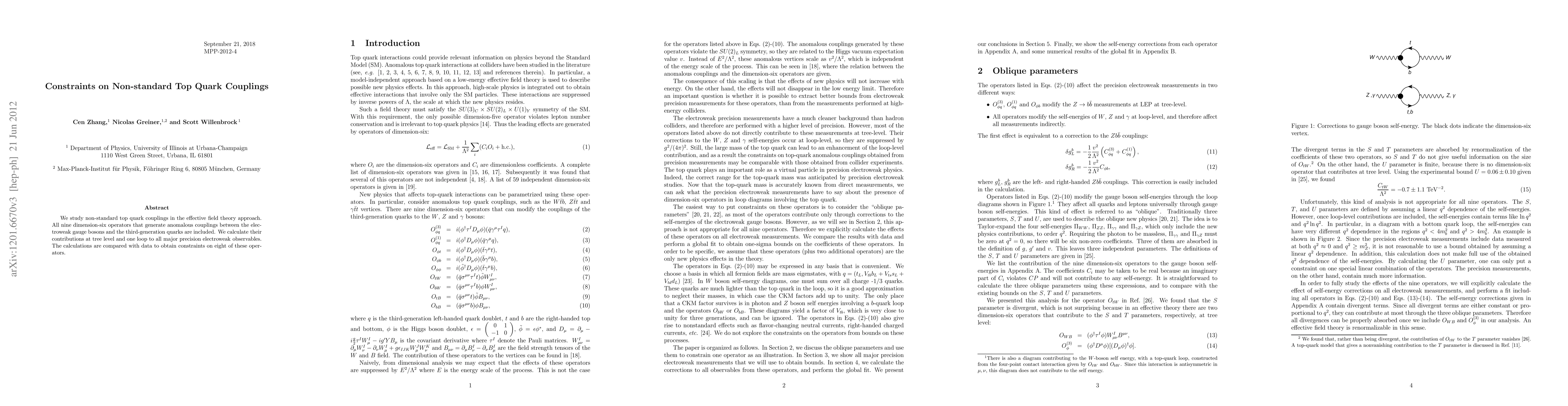 The study examines non-standard top quark couplings using an effective field theory approach, including nine dimension-six operators that generate anomalous couplings between electroweak gauge bosons and third-generation quarks. Contributions from these operators at tree level and one loop are calculated for major precision electroweak observables.