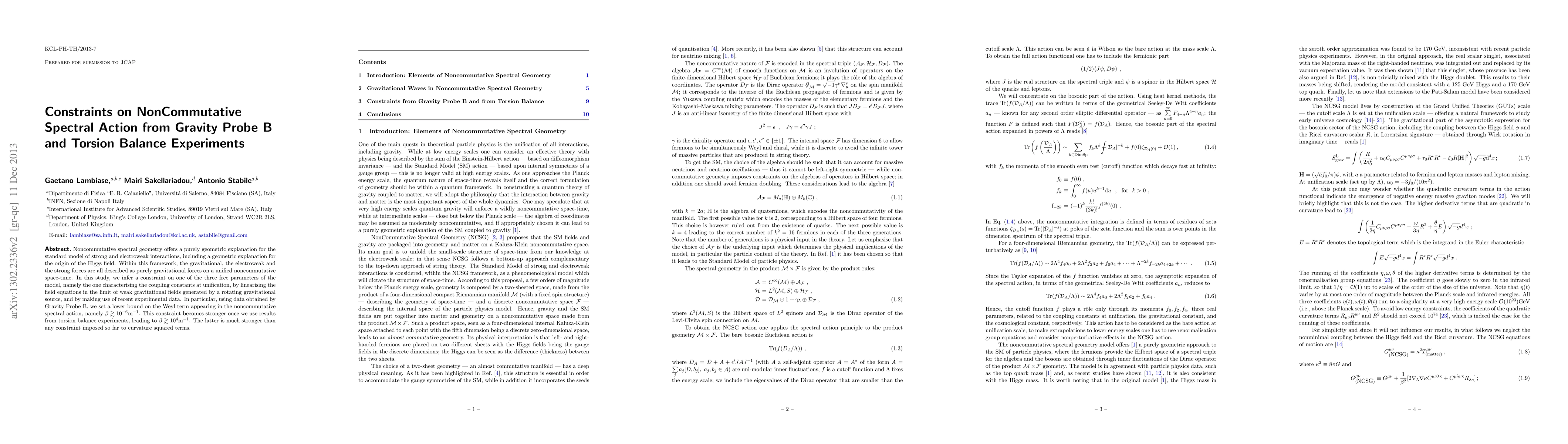 This paper sets new constraints on the Weyl term in noncommutative spectral geometry using Gravity Probe B and torsion balance experimental data, improving existing limits on curvature squared terms significantly to $\beta \gtrsim 10^{4}$m$^{-1}$.