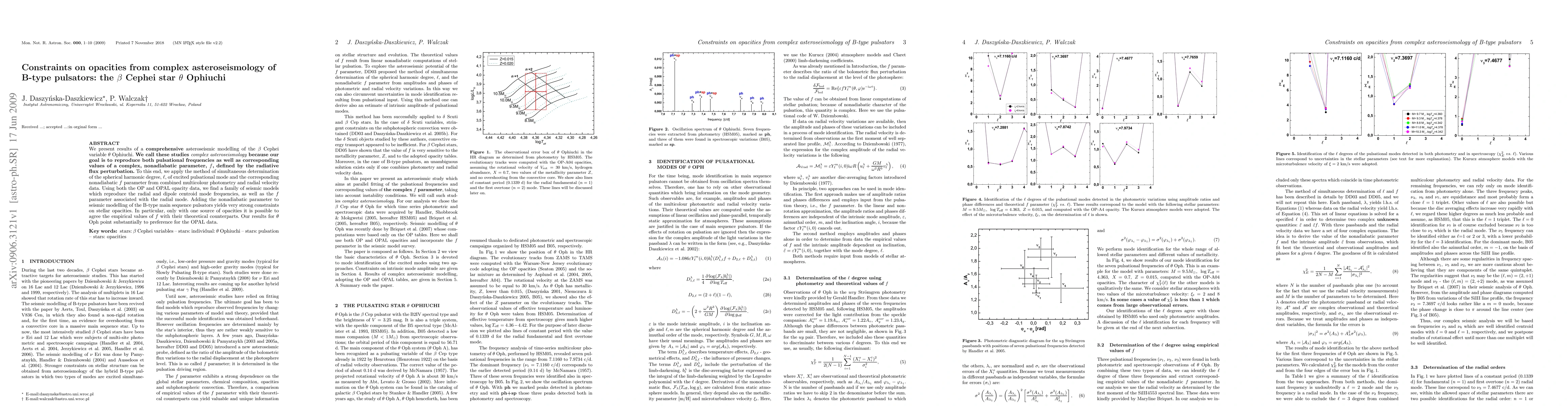 We present results of a {\bf comprehensive} asteroseismic modelling of the $\beta$ Cephei variable $\theta$ Ophiuchi. {\bf We call these studies {\it complex asteroseismology} because our goal is to reproduce both pulsational frequencies as well as corresponding values of a complex, nonadiabatic parameter, $f$, defined by the radiative flux perturbation.} To this end, we apply the method of simultaneous determination of the spherical harmonic degree, $\ell$, of excited pulsational mode and the corresponding nonadiabatic $f$ parameter from combined multicolour photometry and radial velocity data. Using both the OP and OPAL opacity data, we find a family of seismic models which reproduce the radial and dipole centroid mode frequencies, as well as the $f$ parameter associated with the radial mode. Adding the nonadiabatic parameter to seismic modelling of the B-type main sequence pulsators yields very strong constraints on stellar opacities. In particular, only with one source of opacities it is possible to agree the empirical values of $f$ with their theoretical counterparts. Our results for $\theta$ Oph point substantially to preference for the OPAL data.
