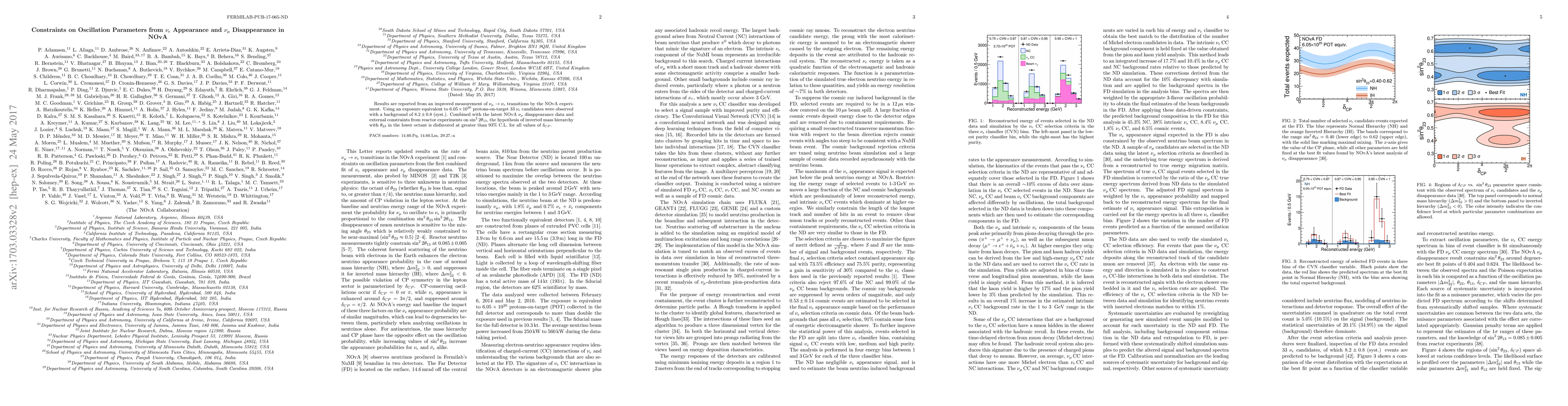 The NOvA experiment reports improved measurements of $\nu_\mu \rightarrow \nu_e$ transitions, observing 33 $\nu_e$ candidates. Combined with $\nu_\mu$ disappearance data and external constraints, the hypothesis of inverted mass hierarchy with $\theta_{23}$ in the lower octant is disfavored at greater than $93\%$ confidence level.