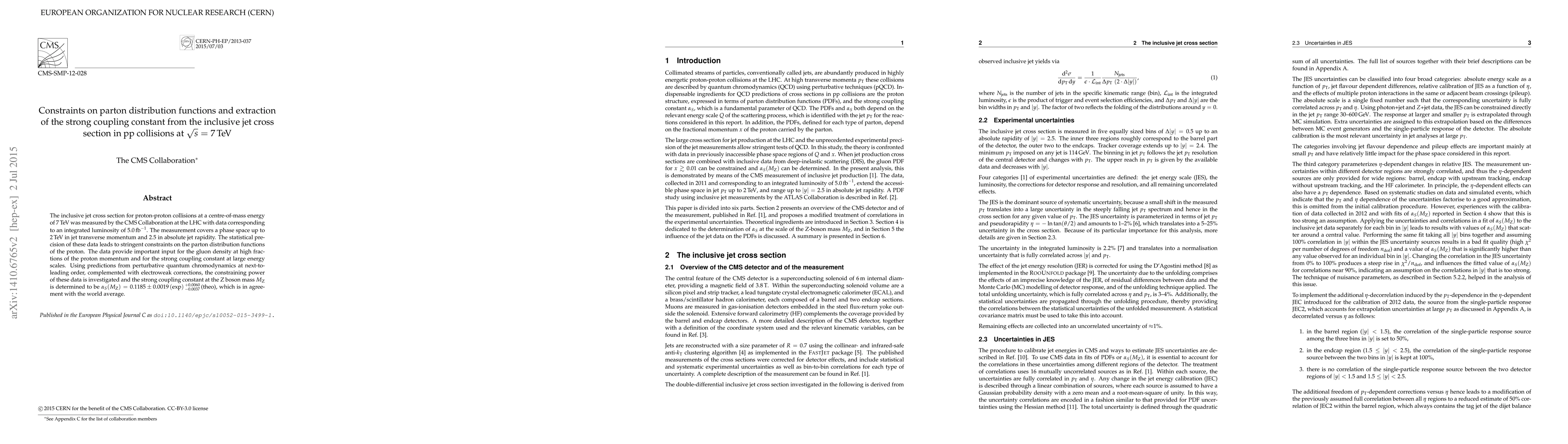 The CMS Collaboration measured the inclusive jet cross section in proton-proton collisions at 7 TeV, providing stringent constraints on parton distribution functions and determining the strong coupling constant α_S(M_Z) = 0.1185 ± 0.0019 (exp) ± 0.0060 (theo), in agreement with the world average.
