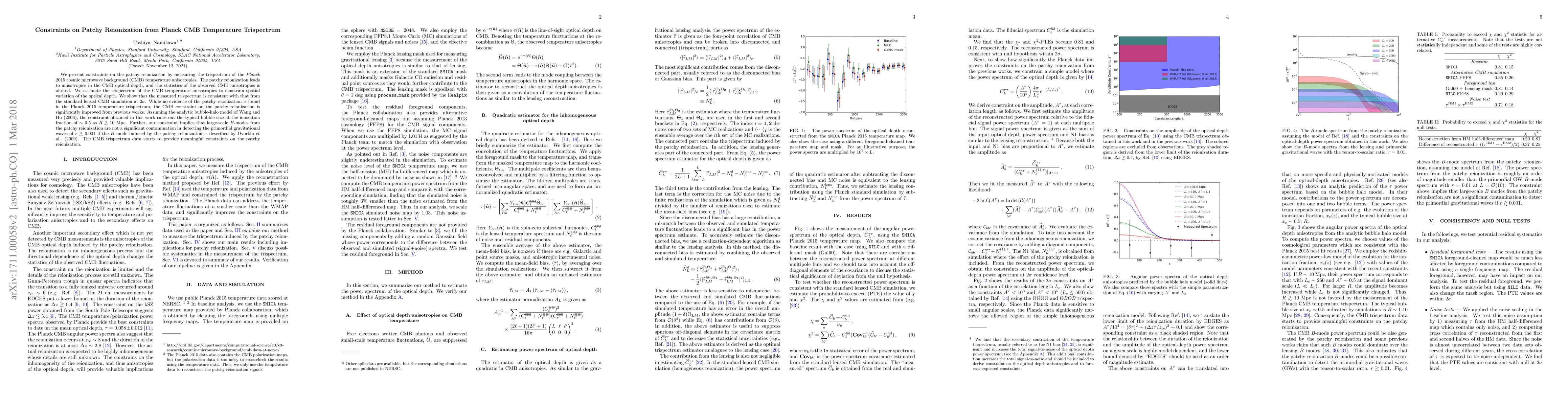 This paper uses the Planck 2015 CMB temperature trispectrum to constrain patchy reionization, finding no evidence but significantly improving previous constraints. The analysis rules out typical bubble sizes of $R\gtrsim 10$ Mpc at an ionization fraction of $\sim0.5$, and suggests that large-scale $B$-modes from patchy reionization are not significant contaminants for detecting primordial gravitational waves.