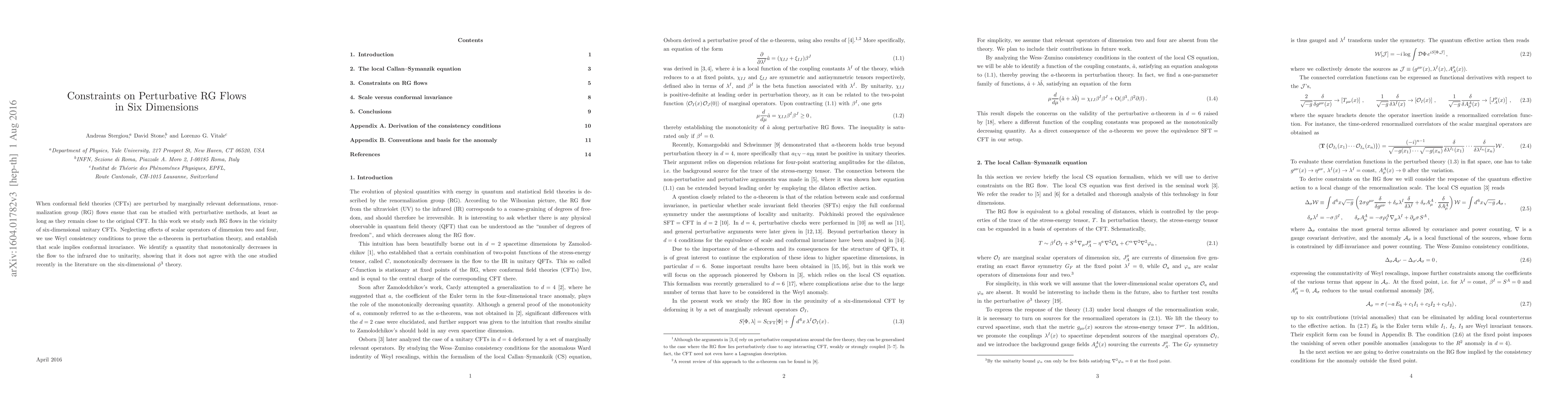 This paper investigates perturbative renormalization group (RG) flows near six-dimensional unitary conformal field theories (CFTs), proving the $a$-theorem and demonstrating that scale invariance implies conformal invariance. It identifies a new decreasing quantity in the RG flow, which differs from similar measures in the six-dimensional $\phi^3$ theory.