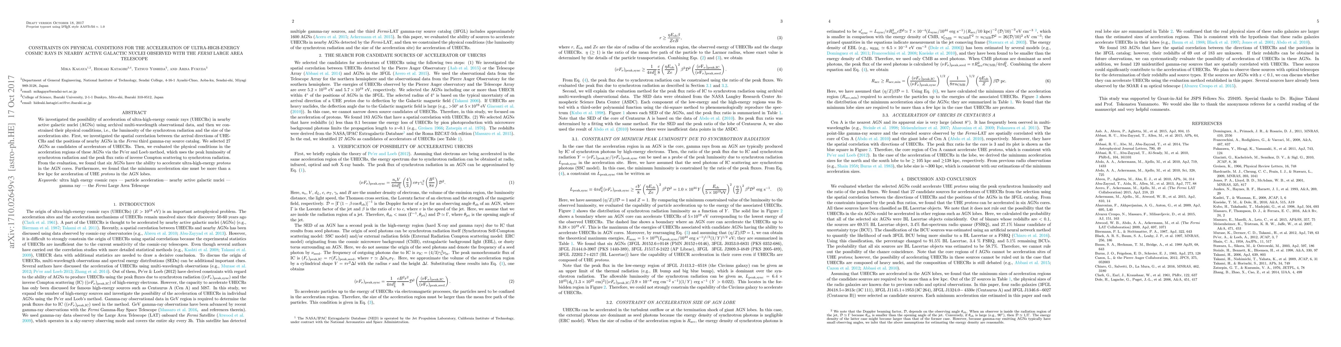 We investigated the possibility of acceleration of ultra-high-energy cosmic rays (UHECRs) in nearby active galactic nuclei (AGNs) using archival multi-wavelength observational data, and then we constrained their physical conditions, i.e., the luminosity of the synchrotron radiation and the size of the acceleration site. First, we investigated the spatial correlation between the arrival directions of UHECRs and the positions of nearby AGNs in the Fermi third gamma-ray source catalog. We selected 27 AGNs as candidates of accelerators of UHECRs. Then, we evaluated the physical conditions in the acceleration regions of these AGNs via the Pe'er and Loeb method, which uses the peak luminosity of synchrotron radiation and the peak flux ratio of inverse Compton scattering to synchrotron radiation. From the evaluation, we found that six AGNs have the ability to accelerate ultra-high-energy protons in the AGN cores. Furthermore, we found that the minimum acceleration size must be more than a few kpc for acceleration of UHE protons in the AGN lobes.