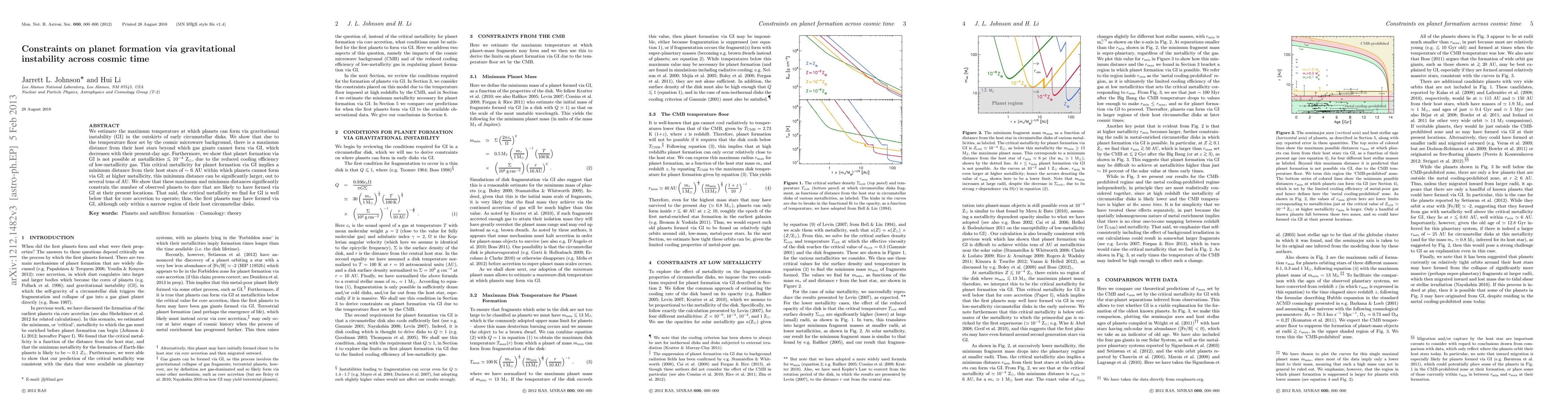 We estimate the maximum temperature at which planets can form via gravitational instability (GI) in the outskirts of early circumstellar disks. We show that due to the temperature floor set by the cosmic microwave background, there is a maximum distance from their host stars beyond which gas giants cannot form via GI, which decreases with their present-day age. Furthermore, we show that planet formation via GI is not possible at metallicities < 10^-4 Z_Sun, due to the reduced cooling efficiency of low-metallicity gas. This critical metallicity for planet formation via GI implies a minimum distance from their host stars of ~ 6 AU within which planets cannot form via GI; at higher metallicity, this minimum distance can be significantly greater, out to several tens of AU. We show that these maximum and minimum distances significantly constrain the number of observed planets to date that are likely to have formed via GI at their present locations. That said, the critical metallicity we find for GI is well below that for core accretion to operate; thus, the first planets may have formed via GI, although only within a narrow region of their host circumstellar disks.