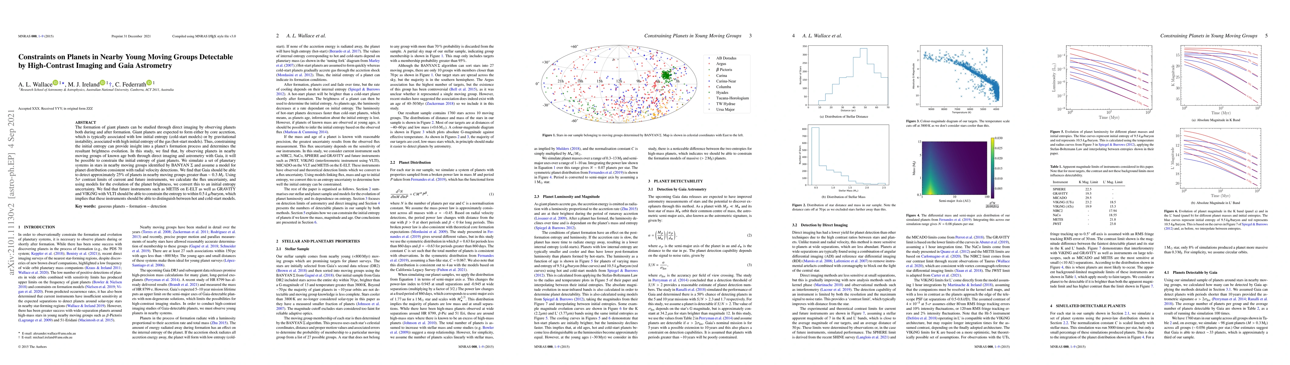 The formation of giant planets is best studied through direct imaging by observing planets both during and after formation. Giant planets are expected to form either by core accretion, which is typically associated with low initial entropy (cold-start models) or by gravitational instability, which corresponds to a high initial entropy of the gas (hot-start models). Thus, constraining the initial entropy provides insight into the planet formation mechanism and determines the resultant brightness evolution. We find that, by observing planets in nearby moving groups of known age both through direct imaging and astrometry with Gaia, it will be possible to constrain the initial entropy of giant planets. We simulate a set of planetary systems in stars in nearby moving groups identified by BANYAN $\Sigma$ and assume a model for planet distribution consistent with radial velocity detections. We find that Gaia should be able to detect approximately 50% of planets in nearby moving groups greater than ~0.3 M$_\text{J}$. Using 5$\sigma$ contrast limits of current and future instruments, we calculate the flux uncertainty, and using models for the evolution of the planet brightness, we convert this to an initial entropy uncertainty. We find that, for future instruments such as MICADO and METIS on E-ELT and VIKiNG with VLTI, the entropy uncertainty is less than 0.5 $k_{B}$/baryon, showing that these instruments should be able to distinguish between hot and cold-start models.
