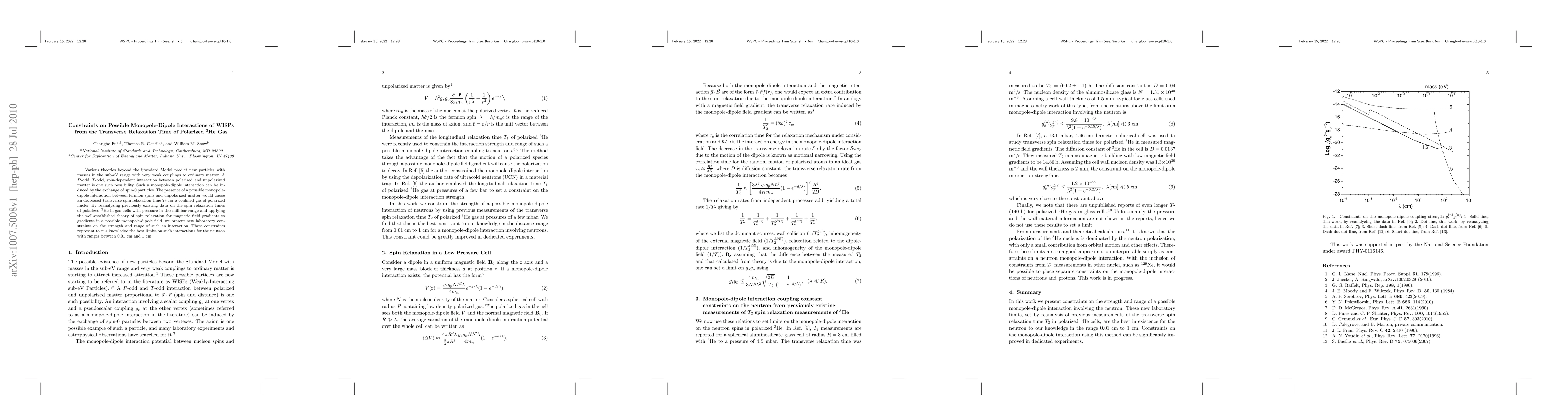 Researchers constrain possible monopole-dipole interactions between fermion spins and matter, setting limits on their strength and range with data from polarized $^3$He gas experiments.
