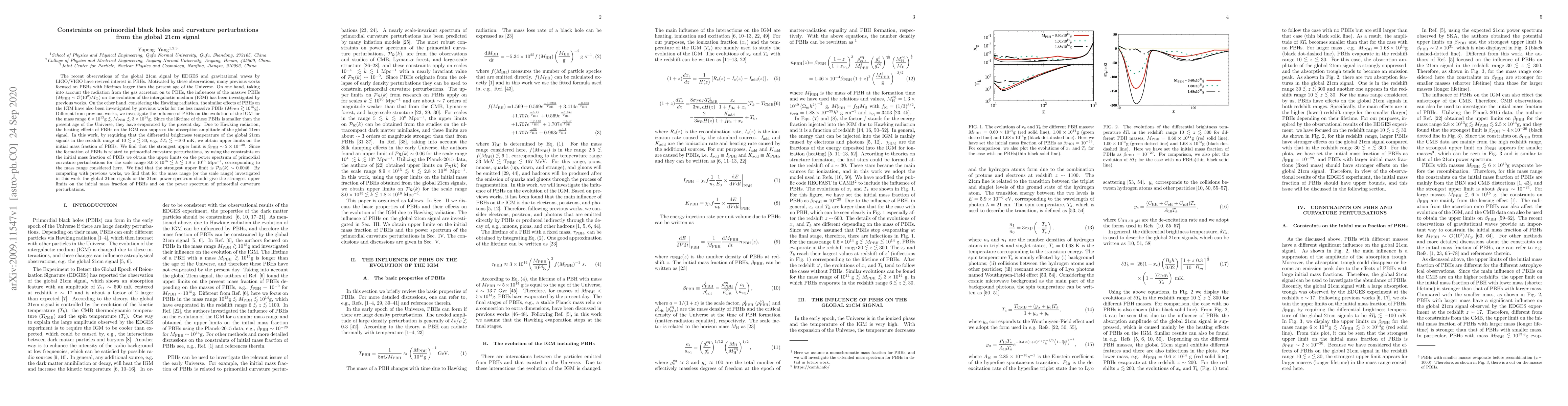 The recent observations of the global 21cm signal by EDGES and gravitational waves by LIGO/VIGO have revived interest in PBHs. Different from previous works, we investigate the influence of PBHs on the evolution of the IGM for the mass range $6\times 10^{13} {\rm g} \lesssim M_{\rm PBH}\lesssim 3\times 10^{14} \rm g$. Since the lifetime of these PBHs is smaller than the present age of the Universe, they have evaporated by the present day. Due to Hawking radiation, the heating effects of PBHs on the IGM can suppress the absorption amplitude of the global 21cm signal. In this work, by requiring that the differential brightness temperature of the global 21cm signals in the redshift range of $10\lesssim z \lesssim 30$, e.g., $\delta T_{b} \lesssim -100~\rm mK$, we obtain upper limits on the initial mass fraction of PBHs. We find that the strongest upper limit is $\beta_{\rm PBH} \sim 2\times 10^{-30}$. Since the formation of PBHs is related to primordial curvature perturbations, by using the constraints on the initial mass fraction of PBHs we obtain the upper limits on the power spectrum of primordial curvature perturbations for the scale range $8.0\times 10^{15}\lesssim k \lesssim 1.8\times 10^{16}~\rm Mpc^{-1}$, corresponding to the mass range considered here. We find that the strongest upper limit is $\mathcal P_{\mathcal R}(k) \sim 0.0046$. By comparing with previous works, we find that for the mass range (or the scale range) investigated in this work the global 21cm signals or the 21cm power spectrum should give the strongest upper limits on the initial mass fraction of PBHs and on the power spectrum of primordial curvature perturbations.