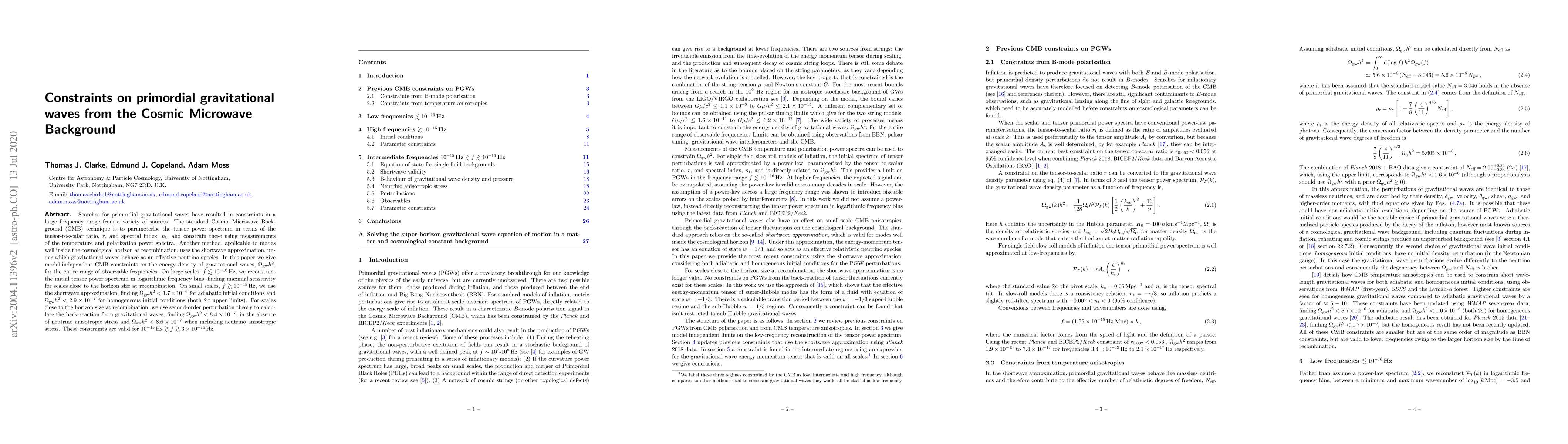 Searches for primordial gravitational waves have resulted in constraints in a large frequency range from a variety of sources. The standard Cosmic Microwave Background (CMB) technique is to parameterise the tensor power spectrum in terms of the tensor-to-scalar ratio, $r$, and spectral index, $n_{\rm t}$, and constrain these using measurements of the temperature and polarization power spectra. Another method, applicable to modes well inside the cosmological horizon at recombination, uses the shortwave approximation, under which gravitational waves behave as an effective neutrino species. In this paper we give model-independent CMB constraints on the energy density of gravitational waves, $\Omega_\textrm{gw} h^2$, for the entire range of observable frequencies. On large scales, $f \lesssim 10^{-16}\, \text{Hz}$, we reconstruct the initial tensor power spectrum in logarithmic frequency bins, finding maximal sensitivity for scales close to the horizon size at recombination. On small scales, $f \gtrsim10^{-15}\,\mbox{Hz}$, we use the shortwave approximation, finding $\Omega_\textrm{gw} h^2 < 1.7 \times10^{-6}$ for adiabatic initial conditions and $\Omega_\textrm{gw} h^2 < 2.9 \times10^{-7}$ for homogeneous initial conditions (both $2\sigma$ upper limits). For scales close to the horizon size at recombination, we use second-order perturbation theory to calculate the back-reaction from gravitational waves, finding $\Omega_\textrm{gw} h^2 < 8.4 \times10^{-7}$, in the absence of neutrino anisotropic stress and $\Omega_\textrm{gw} h^2 < 8.6 \times10^{-7}$ when including neutrino anisotropic stress. These constraints are valid for $ 10^{-15}\, \text{Hz} \gtrsim f \gtrsim 3 \times 10^{-16}\, \text{Hz}$.