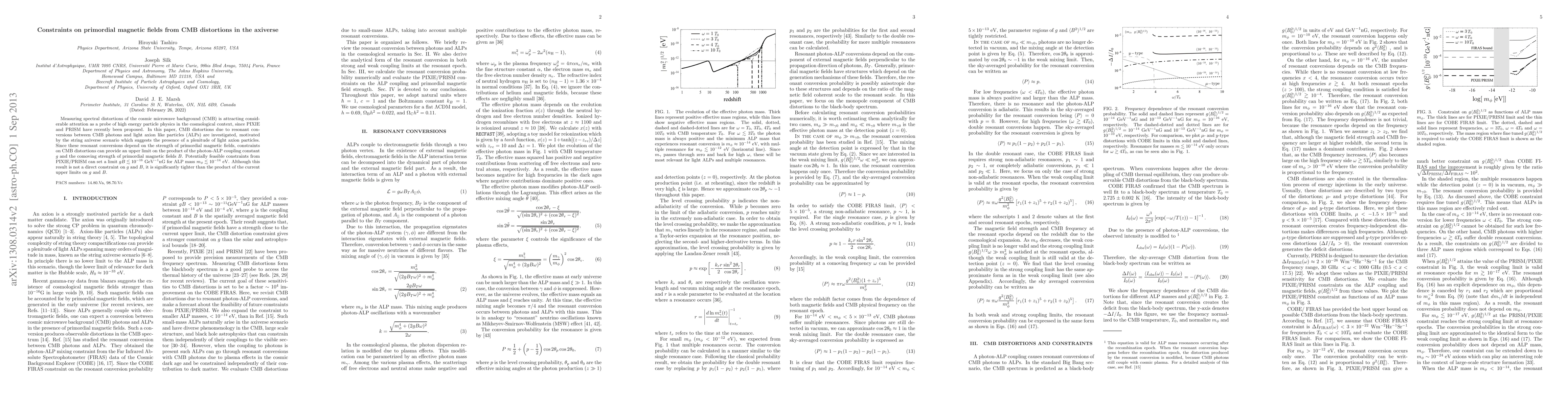Measuring spectral distortions of the cosmic microwave background (CMB) is attracting considerable attention as a probe of high energy particle physics in the cosmological context, since PIXIE and PRISM have recently been proposed. In this paper, CMB distortions due to resonant conversions between CMB photons and light axion like particles (ALPs) are investigated, motivated by the string axiverse scenario which suggests the presence of a plenitude of light axion particles. Since these resonant conversions depend on the strength of primordial magnetic fields, constraints on CMB distortions can provide an upper limit on the product of the photon-ALP coupling constant g and the comoving strength of primordial magnetic fields B. Potentially feasible constraints from PIXIE/PRISM can set a limit g B < 10^{-16} GeV^{-1} nG for ALP mass, m_\phi < 10^{-14} eV. Although this result is not a direct constraint on g and B, it is significantly tighter than the product of the current upper limits on g and B.