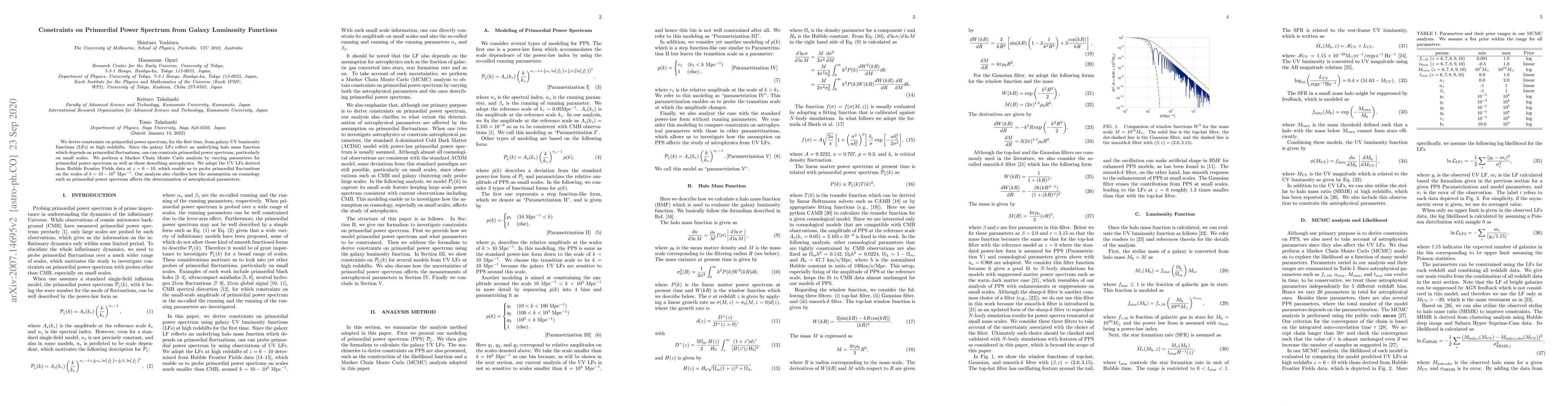 This paper derives constraints on the primordial power spectrum using galaxy UV luminosity functions at high redshifts, revealing its influence on small scales. The study employs Markov Chain Monte Carlo analysis to explore variations in both primordial and astrophysical parameters, utilizing UV LFs from Hubble Frontier Fields data at $z = 6 -10$.