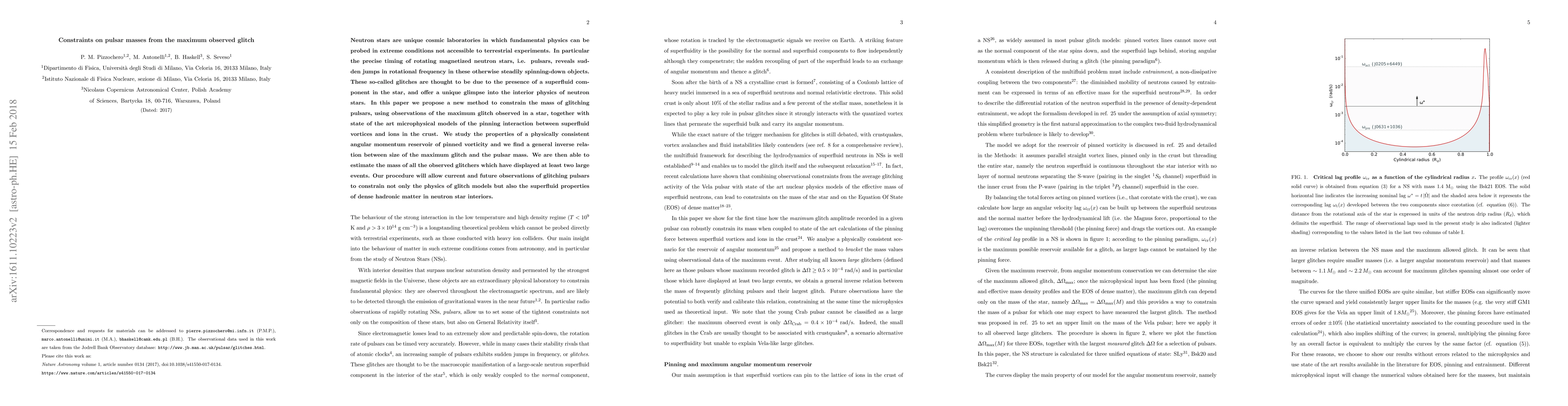 Pulsar glitches, sudden jumps in frequency in otherwise steadily spinning down radio pulsars, offer a unique glimpse into the superfluid interior of neutron stars. The exact trigger of these events remains, however, elusive and this has hampered attempts to use glitch observations to constrain fundamental physics. In this paper we propose a new method to measure the mass of glitching pulsars, using observations of the maximum glitch recorded in a star, together with state of the art microphysical models of the pinning interaction between superfluid vortices and ions in the crust. Studying systematically all the presently observed large glitchers, we find an inverse correlation between size of the maximum glitch and the pulsar mass. Our procedure will allow current and future observations of glitching pulsars to constrain not only the physics of glitch models but also the equation of state of dense matter in neutron star interiors.