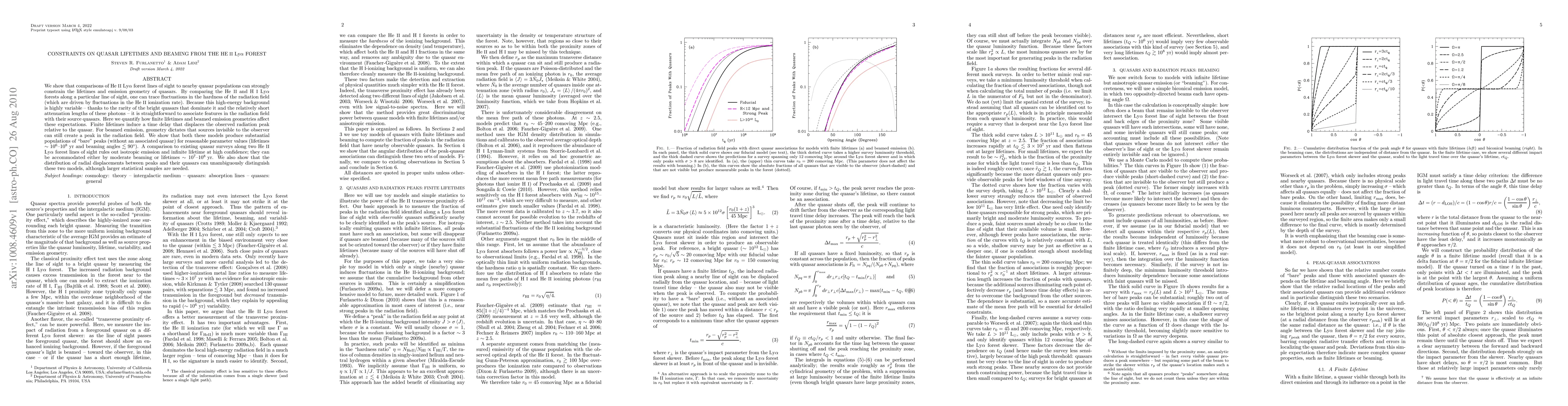 This paper demonstrates that analyzing the HeII Lyman-alpha forest in relation to nearby quasar populations can constrain quasar lifetimes and emission geometries. The study finds that finite lifetimes and beamed emission lead to "bare" peaks in the radiation field, and existing quasar surveys strongly rule out isotropic emission and infinite lifetimes, favoring moderate beaming or lifetimes of ~10^7-10^8 years.